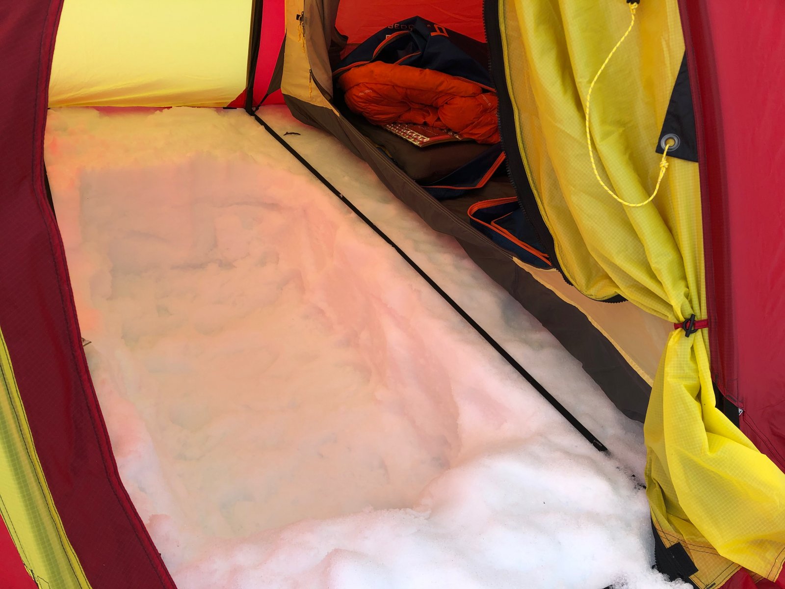 Jeg er forholdsvis fersk når det gjelder vintertelting, men blei umiddelbart så glad i arbeidsgropa i forteltet at jeg også har truet å ta med spade på sommerturer. (En gang teltet vi et sted det egentlig ikke gikk an å telte og da hadde vi ståhøyde i forteltet også på sommeren. Dessverre var det like kupert i innerteltet) Etter litt prøving og feiling har jeg funnet at min ideelle arbeidsgrop er ca knedyp. Da er det godt å sitte og jeg slipper å jobbe for å komme meg opp i innerteltet. (Dersom man støter på et lag med sukkersnø under gravinga kan den fort bli dypere enn man tenkte.) Nygravd grop i nyanskaffet telt. Vi har akkurat oppgradert fra Helsport Fjellheimen til Spitsbergen. Det var lurt. Det eineste jeg kunne savne var to dører i forteltet slik at jeg kunne måke til begge sider. Kjøkkenbenk fra tidligere tur. En drøm å lage mat under slike forhold.- 23 svar