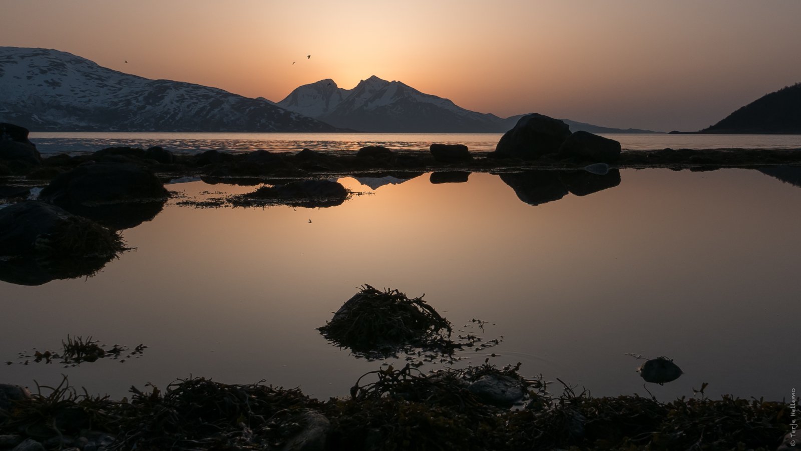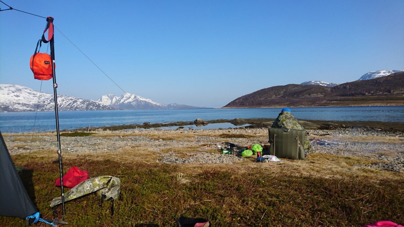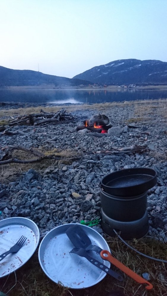 18. Sist helg startet med et par dager med vårtemperaturer med opptil flere siffer. Yr.no fulgte opp med alle varseltrekantene de fant (bortsett fra skogbrann), så for å unngå all fare for åpne elver, sørpeskred o.l. tok vi rett og slett en tarpovernatting i fjæra. Fylte sekkene på fredagskveld med god mat og varme klær og spaserte en heil kilometer utover Lyfjorden. Toretters middag på bål og stormkjøkken (inkludert en aldri så liten Mack-øl) smakte fortreffelig. Man husker sjelden å ta bilde før maten er spist. Kuldegrader om natta blei avløst av morgensol og bålkaffe servert i soveposen av @TerjeH. Formiddagen gikk ellers med til de samme aktivitetene som vi ville gjort heime: Sitte i hver sin godstol under pledd, drikke kaffe, lese bok og surfe på Internett. En gang etter 12 gikk vi tom for kjeks og fant ut vi måtte returnere. I Bellvika kunne vi gjøre unna dagens samaritangjerning ved å plukke opp to haikere. En arbeidsinnflytter fra Oslo hadde besøk av en kanadisk kompis. De hadde vært på hyttetur i ei utleiehytte og blitt forledet av ruteopplysninga til å tro at det går busser på yttersida av Kvaløya på en lørdag. De skulle fått lov å bruke et par timer på å spasere inn til byen... Solnedgang fargelagt av sandsky fra Sahara. Eller var den blitt avløst av skogbrannskyer fra øst? Passelig årstid for å sove ute i fjæra. Fuglene har ikke startet hekkinga på ordentlig ennå, så det eineste som forstyrret nattesøvnen var en enslig rypestegg og et par isras oppe i fjellsida.