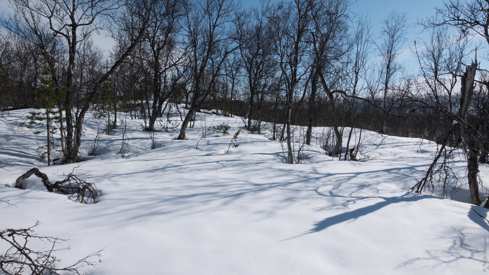 16. Så kom vinteren tilbake igjen. Lørdag blei brukt til å bivåne eling etter eling blåse forbi vinduene. Søndag opprant likevel med varslet sol og oppholdsvær. Vi hadde en avtale om ettermiddagstur på ski med et par venner, men for å få litt uteliv på formiddagen også pakket vi sekken og spiste frokost et par hundre meter oppi skogen. Her går det masse stier om sommeren. Nå var det litt meir sånn to steg fram og ett til knes. Med rette kameravinkel ser man ikke at man er midt i lysløypa heller... @TerjeH hadde vært her tidligere i vinter, så vi fant et ferdig bål som hadde tint fram. Dermed blei det bålkaffe og (v)arme riddere på stormkjøkken. Vel heime fikk vi vite at det blei vanskelig å synkronisere ledig turtid for medlemmer av tre familienheter og få unnagjort planlagt topptur før seinkveld. Dermed kunne vi starte tidligere og fikk en deilig solskinnstur på Tverrfjellet i vindstille og passe mye folk. Utsikt til de kjente skitoppene på Kattfjordeidet. Skittentind rando blei avviklet dagen før slik at enkelte ruter så ut som om trakkemaskinen hadde vært der. Det har blitt lite toppturer i vinter så kondis og kjøreform var ikke heilt på plass. Når fotografen bare tar mange nok bilder greier man likevel å finne ett der jeg bare ser litt ut som ei skadeskutt kråke. Det kommer også tydelig fram at vi ikke fikk førstesporet.
