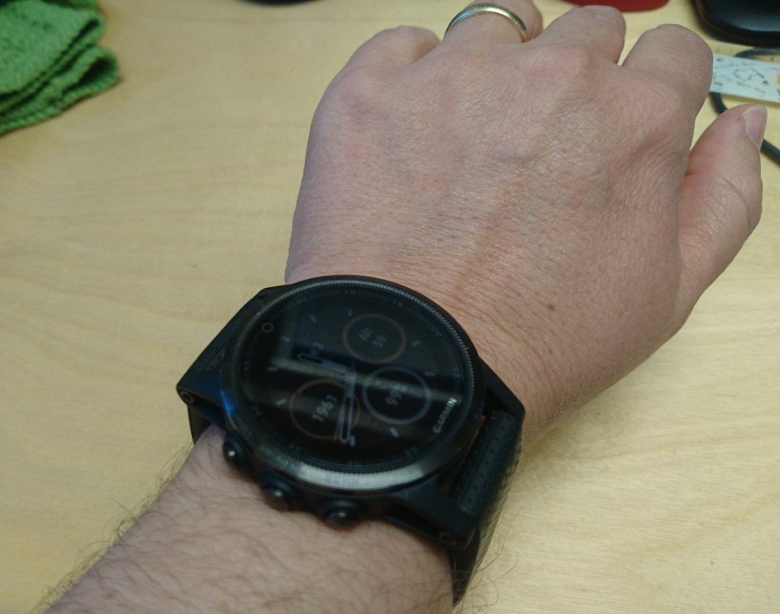 21. Sportsklokker for smale handledd er kjempevanskelig. Dersom du ikke trenger GPS kan du slippe unna med fitbit og venner. Jeg hadde lyst på klokke med GPS (for sporing av lengde/høyde, lage track for seinere bruk og mulighet for å finne veien heim i nødsfall), men hadde egentlig gitt opp håpet. Alt var for stort. Så kom Garmin med Fenix 5s - egentlig ei alt for avansert klokke til mitt bruk, men med passe formfaktor. Denne fikk plass på handleddet og var så lite ruvende at jeg har brukt den konstant siden jeg fikk den. På grunn av GPS og pulssensor er den selvfølgelig tykkere enn vanlige armbåndsur, men fortsatt mindre enn storebrødrene. Dvs på vinterturer må den i lomme. Da skjer det alt for mye rundt handleddene med mansjetter, vottestramming og stavreimer til at det er plass. (Forresten forbausende vanskelig å ta godt bilde av eget handledd)