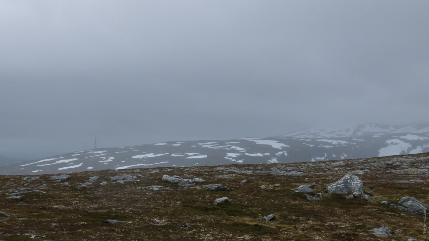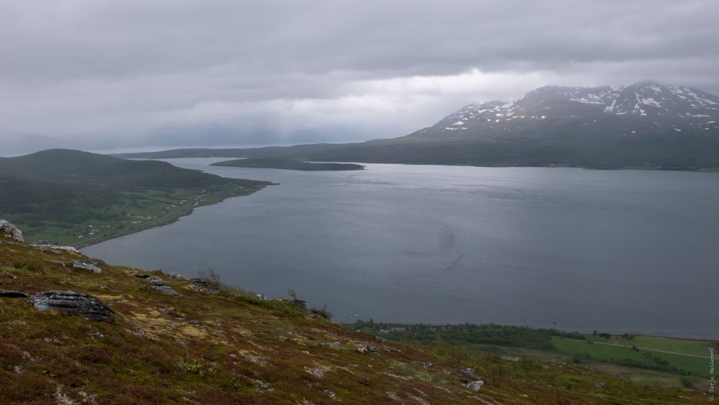 Et søskenbarn i Sørreisa påsto at han måtte bruke napalm for å få fyr i bålpanna i går, på sankthansaften. I Tromsø gadd vi ikke prøve oss med fyrstikker ute, men inntok biffen på restaurant. I dag hadde vi dog håp om at vi skulle få oss en liten trimtur mellom elingene. Første plan var en litt kortere sak, men jeg greide å lure @TerjeH til å ta turen til Straumsbukt og Rundheia. Dette er en ti-på-topp vi ikke har gått på før. Passe bratt og fint opp gjennom skogen, men når vi kom over skoggrensa fikk vinden god tak. Og så kom regnet. Heldigvis hadde vi vinden på skrå bakfra oppe på snaufjellet, så det gikk radig oppover. Halvveis møtte vi en svenske som var og gikk av seg frustrasjonen etter gårdagens fotballtap. Han snakket seg etterhvert så ilter igjen at han nesten måtte gå seg en tur til. På toppen var det ikke snakk om å nyte noen matpakke. Jeg fikk bare huket meg ned bak varden og rotet fram genser og hansker, mens jeg tenkte på ulltrusa og ziplongsen som burde befunnet seg henholdsvis på kropp og i sekk. Mens vi småjogget nedover fikk jeg beskjed om at dette var årets hittil beste ide. Er usikker på om det var sarkasmen eller nesedråpen som dryppet mest. Matpakke og kakao blei nytt i bilen med setevarme og varmeapparat på fullt. Og alle var enige om osv. Frisk bris og regn. Ikke snakk om å skrive i noen bok, nei. Og Dermizaxen min er forresten ikke vanntett lenger. Karakterbygging. Inne i skydekket ligger Gråtind, en av Kvaløyas mange fine skitopper. Et lite opplett på vei ned ga utsikt mot Straumsbukt og Ryøya. Kan rapportere om fersk nysny i Bentsjordtinden.
