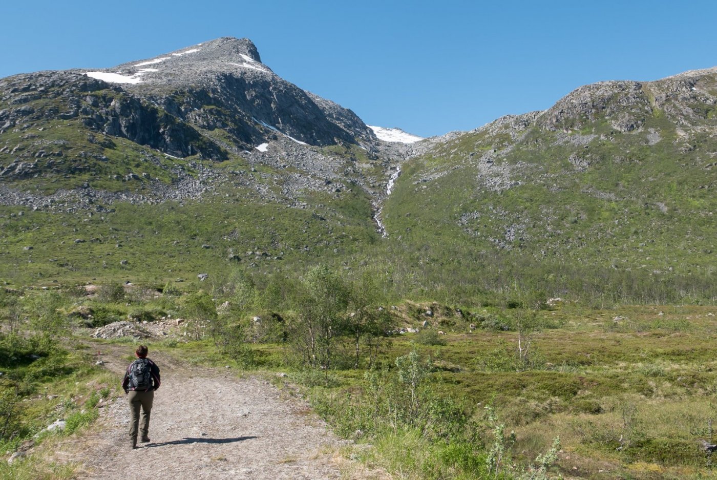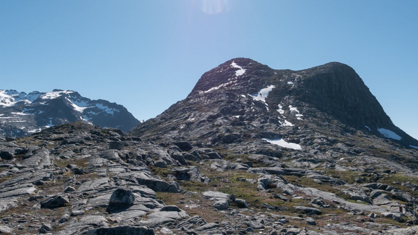 I år kom den Nordnorske sommeren på søndag og varte til mandag. Søndag gikk med til plenklipp så da var løsninga å avslutte arbeidsdagen litt tidlig på mandag. Målet blei Middagsfjellet på Kvaløya i retning Grøtfjord. Deilig og varmt for en forfrossen kropp. Etter en nesten 3 km lang ryggvandring har vi bare siste kneika opp til 678 moh igjen. Selvfølgelig må det serveres middag på Middagsfjellet! Når det er lenge siden forrige sesong er Real helt greit. @TerjeH var grei og bar opp vann til maten, mens jeg hadde glømt å ta med nok drikkevann til meg sjølv til en så varm dag. Vi var her i fjor også, i regn og skodde og så ikke en døyt. I dag kunne vi observere både Breitinden og Hollendaren (en av de mange...) Skifjell for de som liker det litt bratt. Da var det bare 150 meter igjen til bilen. Og 100 høydemetre.