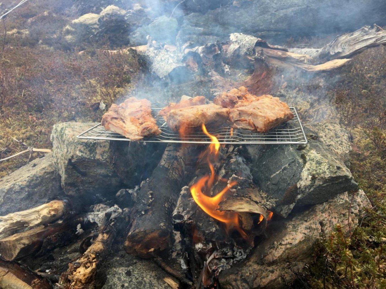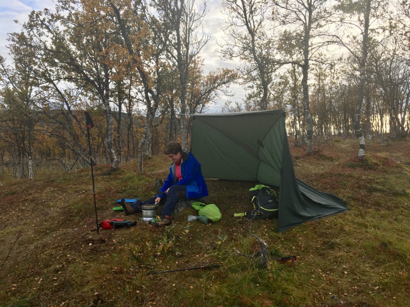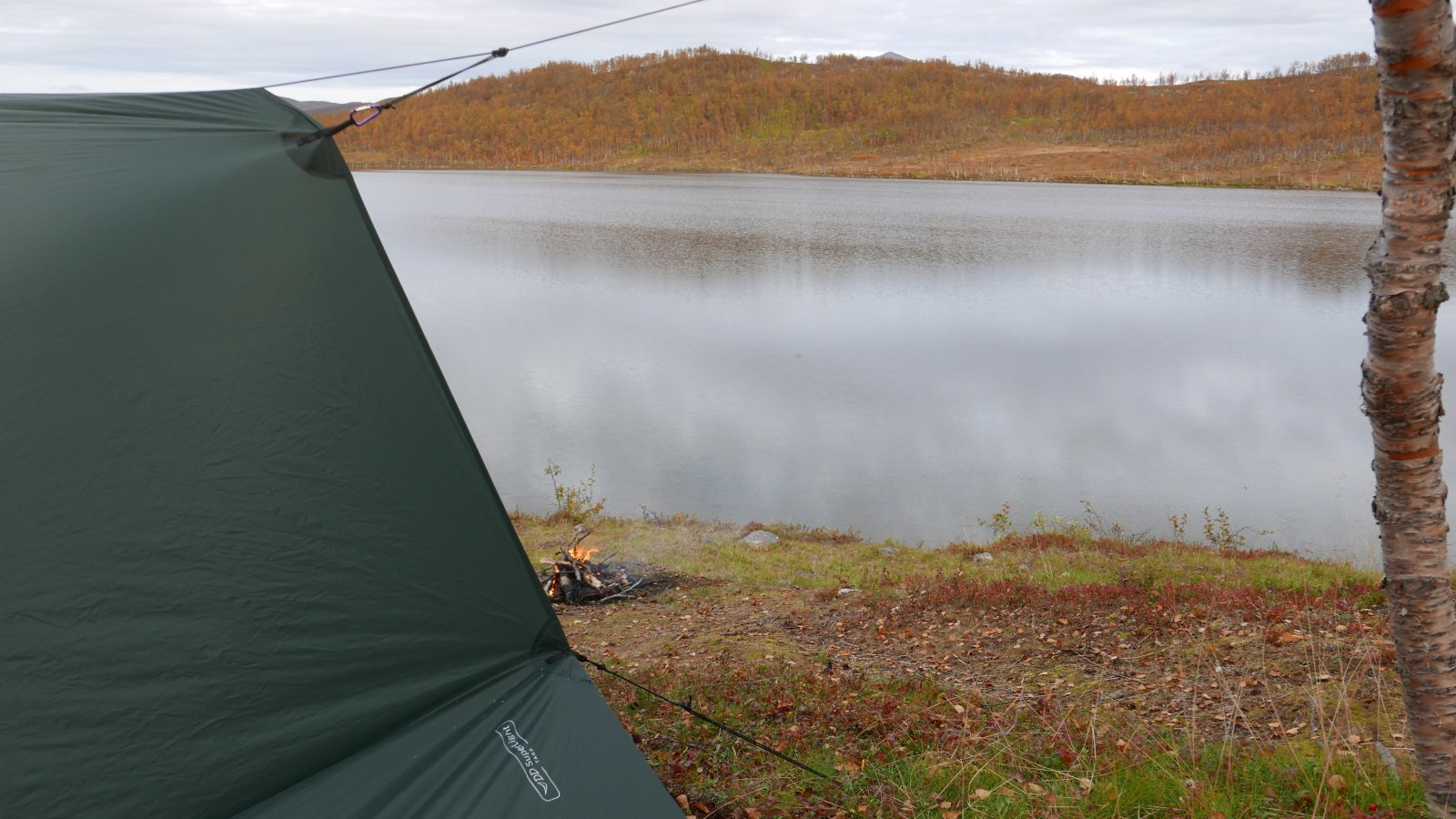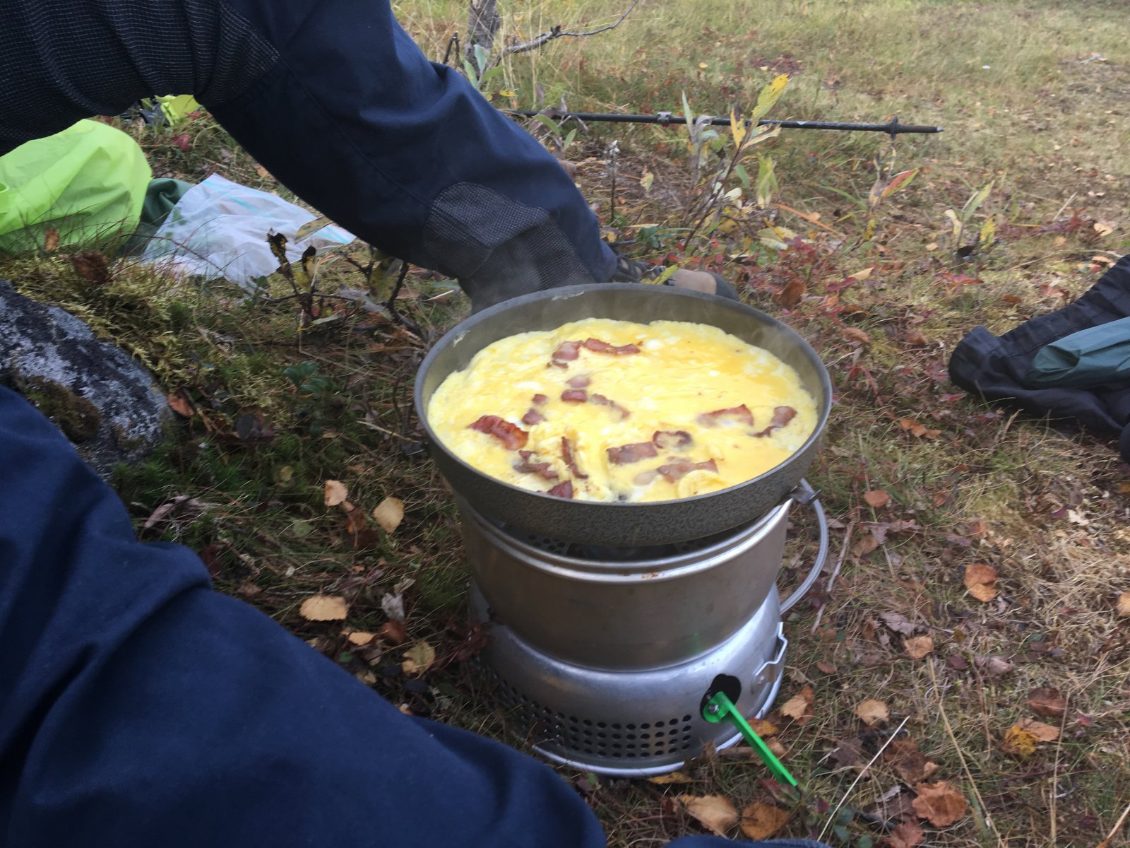 Det kommer lavtrykk. Derfor dro vi heim etter jobb, stappet i sekken og gikk et par kilometer opp til Movikvatnet. Baconomelett til middag smakte intenst godt. @TerjeHfikk prøvd en ny tarpvariant og brent litt bål, mens undertegnede fikk lekt med parafinbrenner. Fant akkurat nok tyttebær til en porsjon trollkrem når vi kom heim. Nedturen var perfekt timet slik at regnet startet når vi sto på parkeringsplassen og det var skjømt når vi gikk inn ytterdøra. Mydlandbacon - man slipper å smøre panna. Jeg var bare sulten og heiv meg i steikinga. Man plutselig hadde jeg en tarp over hodet. Tydelig at dette er et populært turområde. Tror det må ha vært en skoleklasse på overnatting nylig, for det var en del søppel (dopapir) og rot. Men vi greide å skrape sammen nok ved til bål, sjølv om saga var savnet.