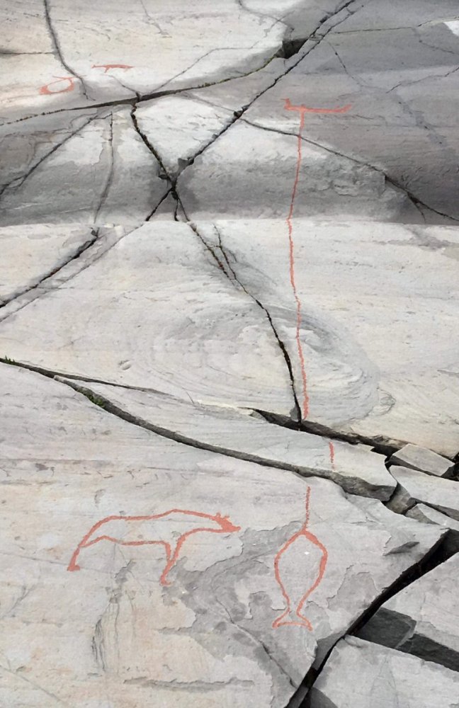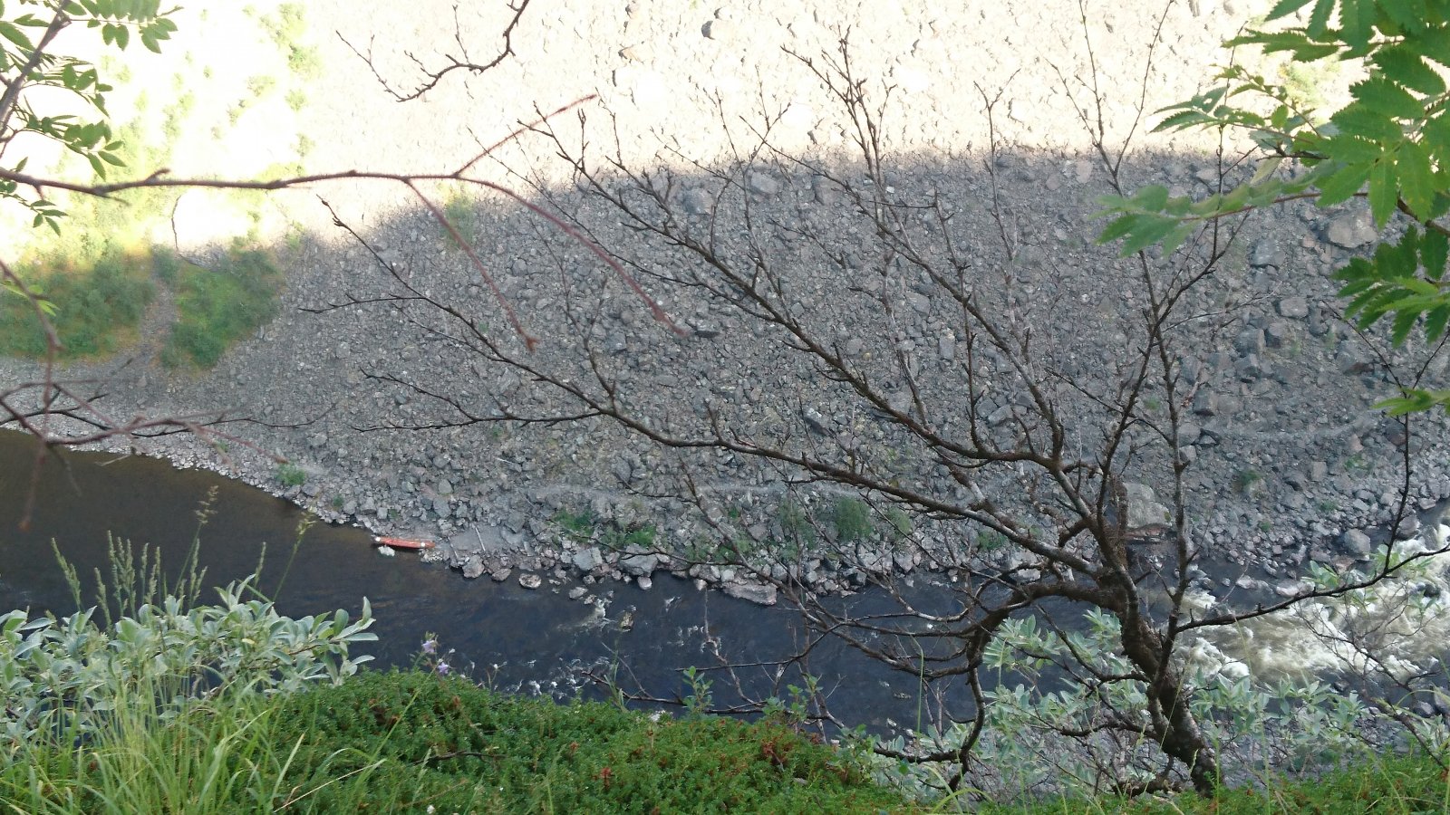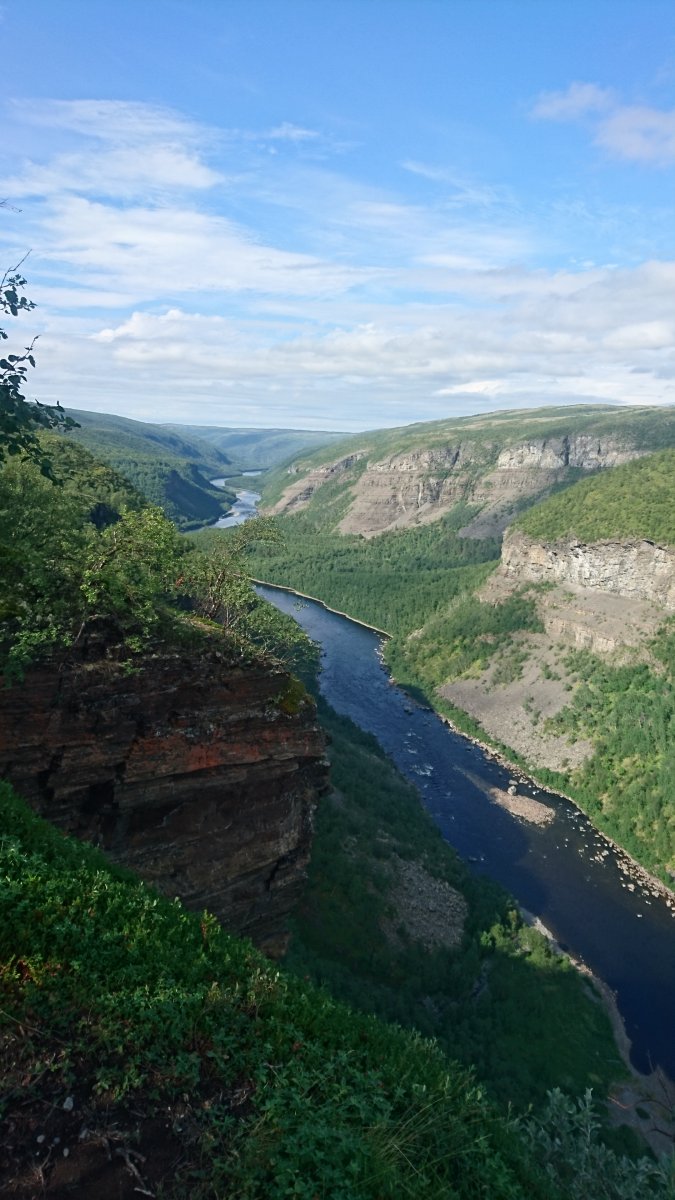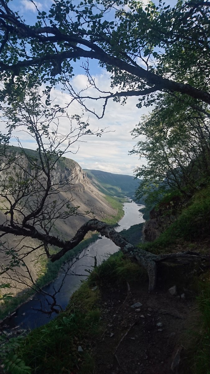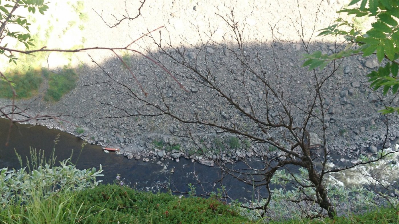 Feriedagen i Alta opprant(!) med regn, så vi startet forsiktig på museet. Der oppdaget vi at det fantes storfiskere (og storskrytere) også for 6000 år siden. Hashtag 200 famner djupt og den kveita var f*en meg stor som en bjørn! (Som om @TerjeH skulle sagt det.) Når det begynte å lysne kjørte vi opp forbi Gargia fjellstue og gikk 6 km tursti inn mot Alta Canyon. Mest bortovertur helt til siste nedstigninga mot kanten av kløfta. Etterhvert steiksol, 15 mygg og tre klegg . Nedover elva. Oppover mot Sautso-gården. Usikker på hvor lang ned, men vi har for kort snøre! Alle bilder jeg har sett fra denne turen fra før viser bare bjørkeskogen på utsiktspunktet, men landskapet underveis ser altså slik ut. Det var meldt regn om ettermiddagen og vi rakk akkurat ned til bilen før den lette yren gikk over i store dråper. På vei tilbake til Alta var det bare så vidt viskerne greide å ta unna. Perfekt timing.