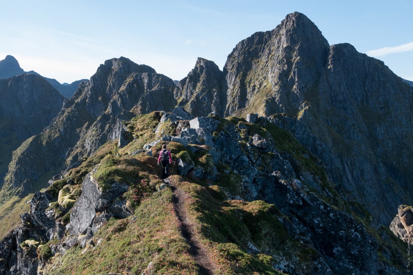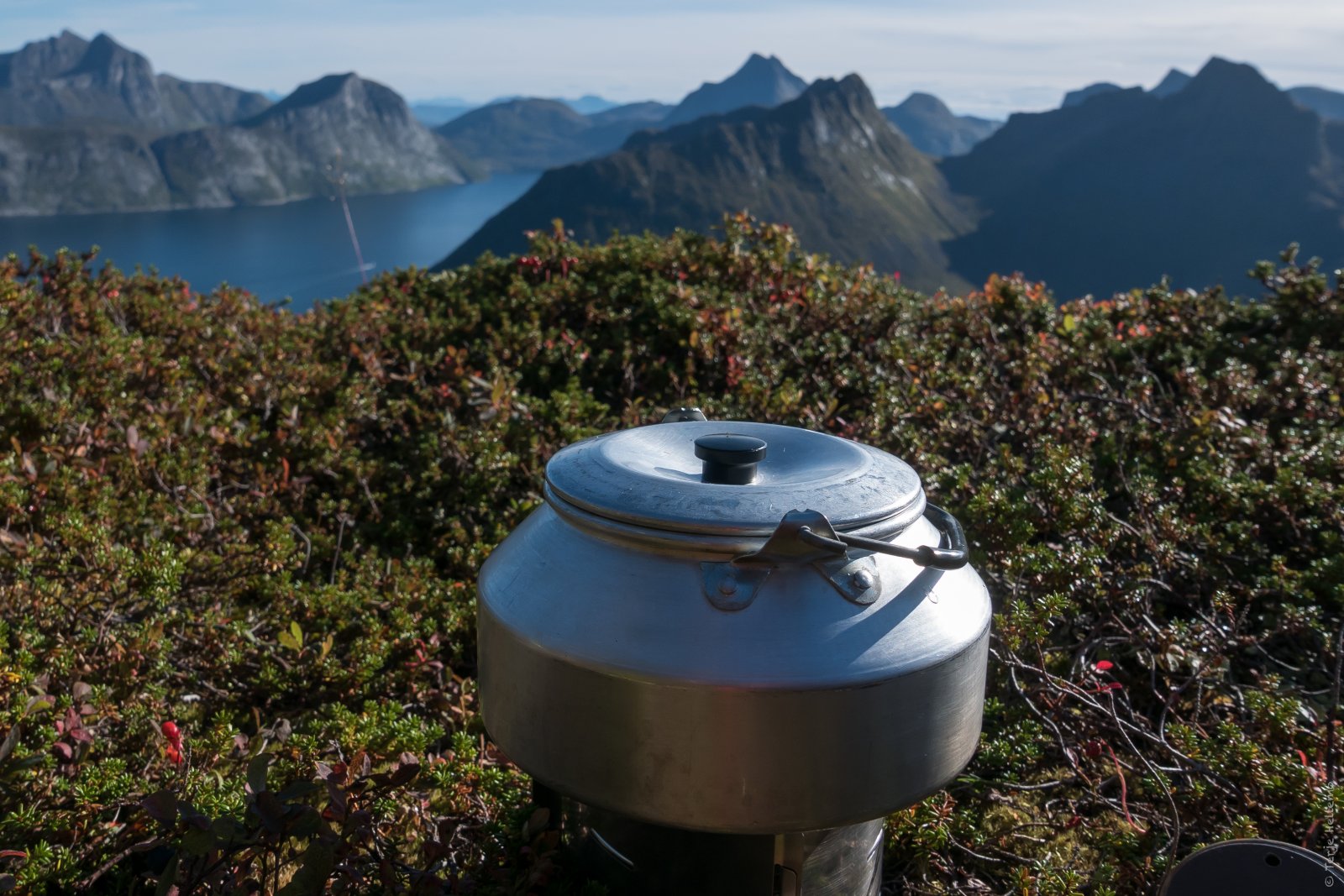 Innimellom to regntunge dager var lørdag en perfekt turdag. @TerjeH og jeg satset på en kortreist tur: Kyle (505 moh) mellom Medfjordvær og Senjahopen. Over 30 grader bratt heile vegen til topps gjør at man får trimmet blodpumpa. Stien er merket og fin og uten vanskelige passasjer, men toppeggen med stup på begge sider gjør at de som er høyderedde godt kan finne seg en annen tur. Litt andpusten, men ved godt mot. Toppeggen i bakgrunnen. Det er like bratt ned på andre sida. Fint å gå bortover eggen mot kassen. Mykjetinden i bakgrunnen. Vi møtte på en fastboende og to turister underveis. Man har etterhvert så mye fint utstyr. I dag var det den gode gamle spritbrenneren som fikk luftet seg i et trekanstativ fra Trangia. Der lyngen stopper går det forresten 200 meter rett ned. Se, alle de fine fjellene innover fjorden med Breitinden innerst! Vi ser ned på hustaket til svigers også. Med flaks så vinner de ei kake i Helselagets lotteri mens vi sitter her.
