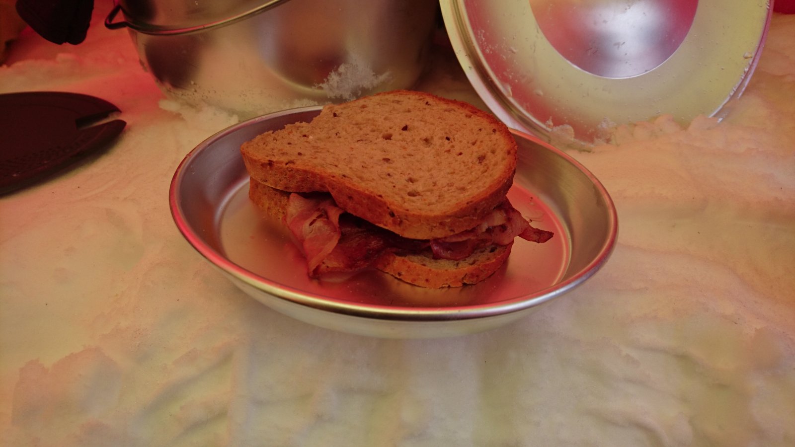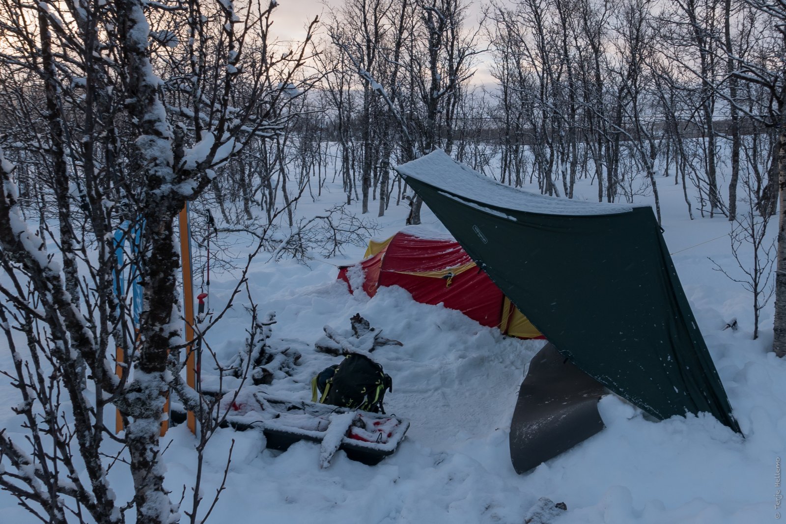 Undertegnede har ikke vært i militæret og unnagjorde grunnskolen lenge for reform-97 slo inn. Dermed har jeg aldri overnattet ute vinterstid! I løpet av de siste to årene har vi hatt en Plan og investert i utstyr en arktisk ekspedisjon verdig. For tre uker siden passet det endelig med vær og andre planer og vi kunne ta en testtur. I mangel av hage måtte vi faktisk pakke i bilen og kjøre ut av byen. Ikke langt, bare over til Kvaløya og Håkøybotn. På med ski og pulk og vandre et par hundre meter inn i skogen. Rakk akkurat å få opp telt og tarp før det blei skjømt. Lett snødrev i lufta gjorde at opplevelsen blei autentisk. Kvelden blei brukt til bålfyring og teststeiking av scones på stormkjøkken. Med 1-2 minusgrader i lufta blei ikke soveutstyret akkurat utfordret. Tvert i mot våknet begge i løpet av natta og måtte lufte/foreta lettelser i antrekk. Læringspunkter: Arbeidsgrop i fortelt er en fantastisk oppfinnelse. Nesten så jeg vurderer å ta med spisspade på sommerturene. Arctic bedding bør kjøpes inn for å slippe all rulling og stapping morgen og kveld. (Begrepet "fillpower" beskriver forresten hvor mye 18 gjess omsydd til sovepose motsetter seg å bli stappet inn i et litt for lite trekk.) Dersom vi skal på lengre vinterturer må nok fruen lære seg å gå med pulk. Teltoppsett i løssnø krever bedre tomtearbeid for at vi skal få strukket teltet ordentlig. Veldig lurt å ha med kjele og kokekaffe slik at morgenfuglen @TerjeHhar noe å trøye seg med. Klokka er 21 og undertegnede sitter spent og venter på å få lov å legge seg. Fin og lett nedsnydd søndagsmorgen. BLT-sandwich uten all den ekle L-en og T-en.
