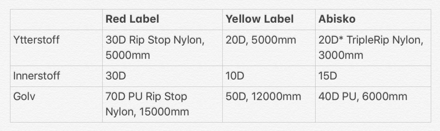 Ein kompis av meg har Shape 3 og eg syns det verkar som eit knallbra telt, men ser ikkje heilt korleis Abisko-serien tilsvarer Red Label i styrke og kvalitet. Har heller ikkje lese noko om at duken til fjellreven er behandla for UV-lys på samme måte som Kerlon er? Det har jo mykje å sei for levetida til eit telt. Uansett, utan å sjå seg blind på teoretiske spesifikasjonar så kan eg sei at i praksis så kjennast dukane veldig forskjellige ut. Ikkje at det eine er bedre enn det andre, men Abisko har ein langt meir elastisk duk, mens Red Label duken er mykje glattare og «stivare». Når det gjelder Shape 3 spesifikt, så opplevde eg høgda i innertelt som litt lav. Hilleberg Unna skal òg vere 100cm i toppen, men det kjennast mykje meir romsleg over haue. Eg tenkjer kanskje dette kan ha noko med at glidelåsen til innerteltet går heilt i topp på Hilleberg sine telt. Forstår ikkje kvifor ikkje fleire teltprodusentar gjer det slik eigentleg. Syns også mindre detaljar som stangkanalar, koppar, glidelås og strammarar verkar meir robust på Red Label, men når det er sagt så meiner eg Fjellreven har lagt seg på ei veldig fornuftig linje med tanke på vekt og styrke. Hadde truleg valgt Abisko Lite over Nallo om eg var eit par centi kortare. *Eg veit at Abisko har ei stripe med 40D langs bunnen, men dette er meir ein gimmick etter mi meining. Utgjer kanskje 10% av duken samla sett og i sterk vind ser eg ikkje føre meg at duken er sterkare enn sitt svakaste punkt uansett. Eg meiner også å hugse at stengene til Shape er tynnare i enden. Stemmer det? I såfall er det òg ein litt tullete måte å spare vekt på syns eg.- 17 svar