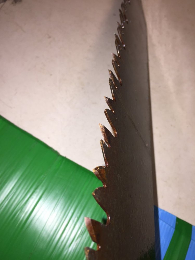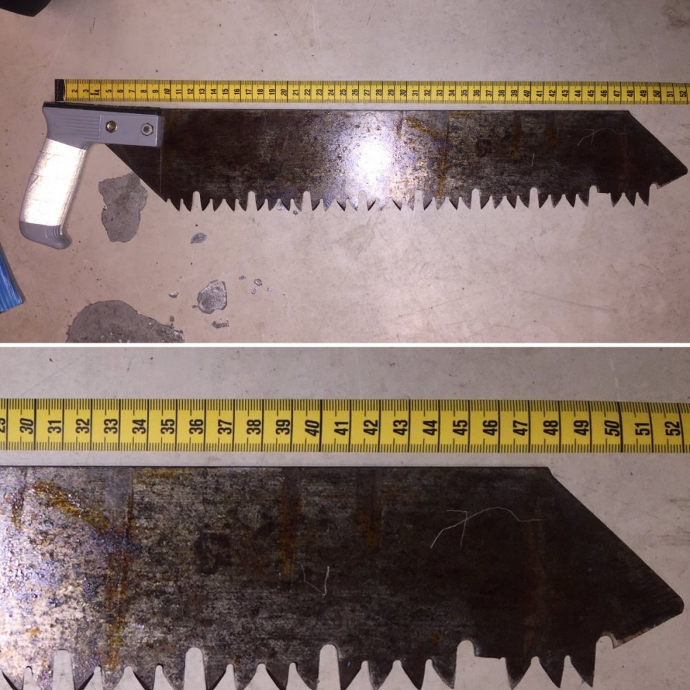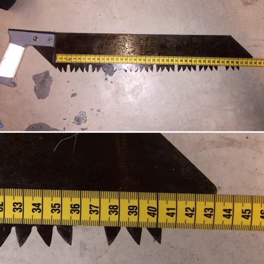 Fikk tatt noen bilder/mål i full fart; Lagd av bladet fra en gammel tømmer-svans og håndtaket fra en kassert rotte-rumpe. Tykkelse på sagbladet 1,5 mm. Lengde på sagblad ca. 430 mm. Lengde totalt inkl. håndtak ca. 570 mm. Vigging drøye 0,7 mm fra senter. Beregn slitasje på vinkelsliper-skive om du får tak i en gammel svans med blad av god gammel kvalitet 😉 Dette var et hastverk-prøveprosjekt, men resultatet ble så bra at jeg har brukt denne de siste årene og totalt forelsket meg i den,,,, Den neste skal jeg legge ned litt mer tid og flid i, slik at den blir litt mer presentabel ovenfor offentlighetens lys🙄