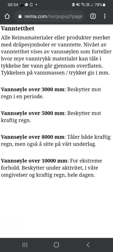 6. Jeg har noen dyre fine jakker som jeg ikke vil bruke til alt av ulike grunner. Jeg kjøpte meg derfor en "Twentyfour" jakke på tilbud til 600 kroner. Naturligvis er den enklere enn for eksempel Norrøna eller Fjellreven jakken min, men den så og føltes grei ut. Når jeg gikk på tur med min samboer ble vi overasket av regn. Hun hadde på seg en billig Bergans jakke fra xxl til 1200 kroner. Begge jakkene hadde en oppgitt vannsøyle på 10.000 mm. Etter kort tid kjente jeg meg fuktig. Hun på sin side var helt tørr. Det viste seg at jakken min var mer vannavstøtende enn vanntett. Jeg gikk å reklamerte på jakken, men ble møtt med at 10.000 ikke er vanntett. Jeg måtte ha minst 20.000 eller 30.000 i vannsøyle sa han på butikken. Det hjalp ikke at jeg ble våt etter ekstremt kort tid. Den beskyttet ikke mer enn en vindjakke sa jeg til karen på butikken. Jeg vet at det eneste som er vanntett er oljhyre, men jeg har aldri opplevd å bli så fort våt med en jakke som har 10.000 mm vannsøyle. Heldigvis oppdaget jeg at ene borrelåser var begynt å løsne, så da fikk jeg levert jakken tilbake på grunn av borrelåsen. Er det normalt å bli våt etter 10 minutter i vestlandsvær med en jakke som er oppgitt til 10.000 mm? Min samboer sin jakke var helt tørr som nevnt innvendig. Hvordan kan det ha seg at to plagg som på papiret har like egenskaper oppleves helt forskjellig? Jeg har syklet en del til jobben, og sykkel jakken min mener jeg har 8000 mm i vannsøyle. Den tålte ganske mye regn i høy fart på sykkel før det begynte å trekke gjennom.