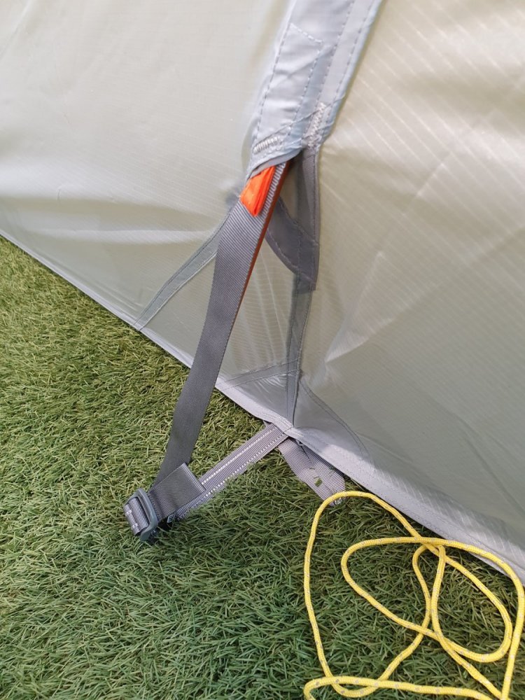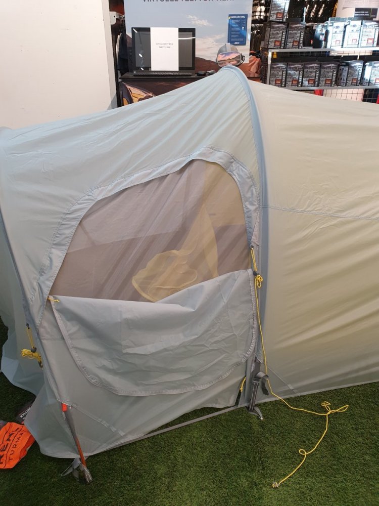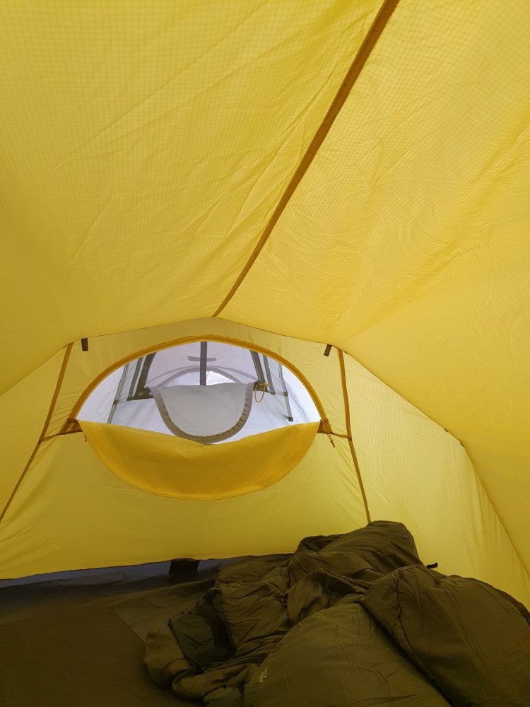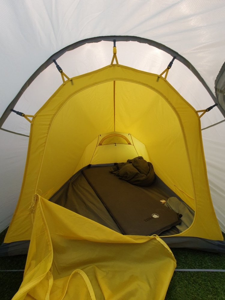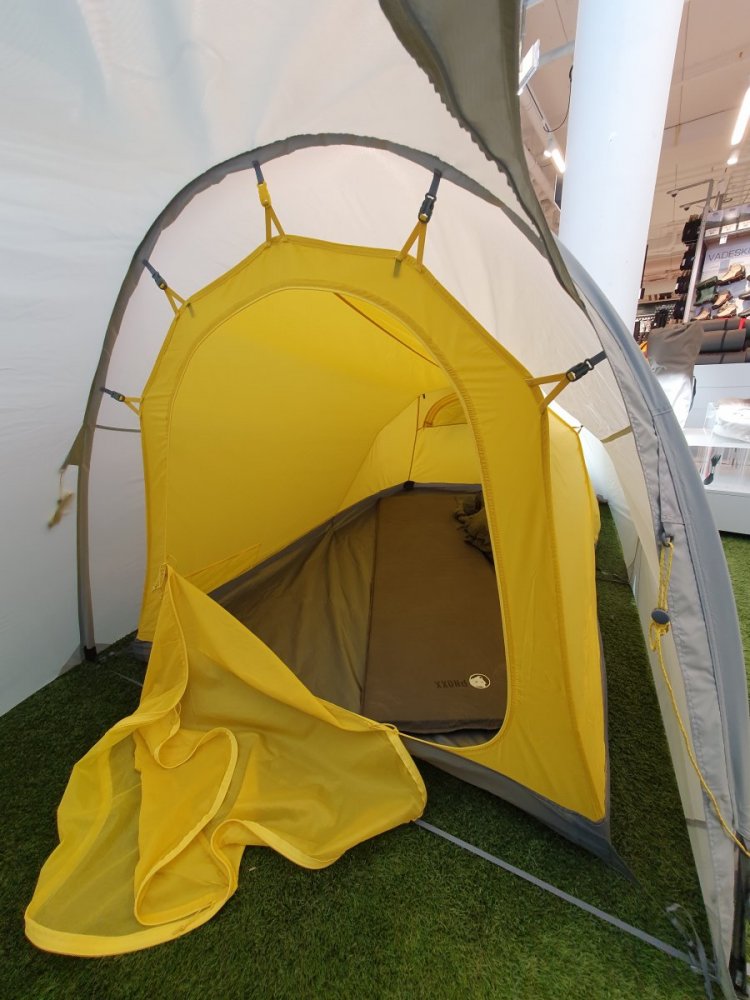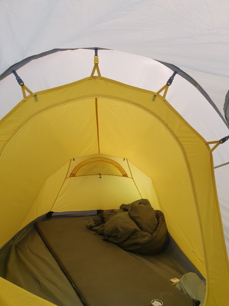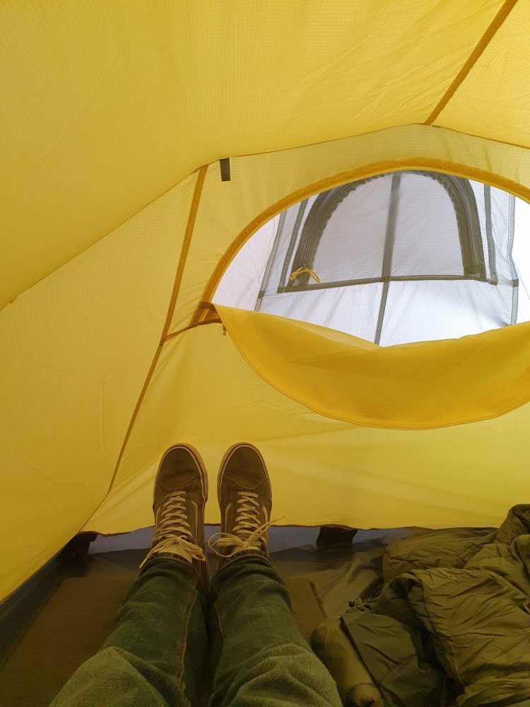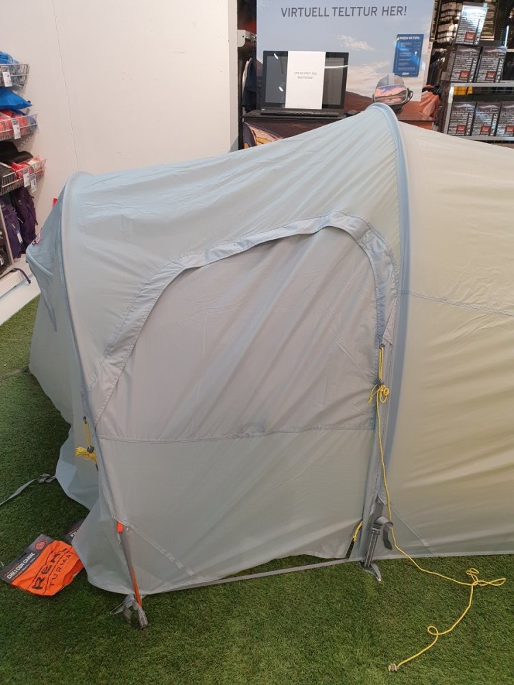 Stikkord: tjukk bunnduk, ellers solid, høyt under taket, en del nye småting som bardunstrammere, ganske lite imponerende indre lengde hvis jeg skal ligge en av to (se bilde) Kul ny dør, med halv myggnetting. Åpner begge veier. Usikker på om fasongen er smart i felt Edit2: jeg er 187 og ligger her med hodet helt inntil døra i innrettet. Skoa er str. 46, så det har jo litt å si også. Forøvrig første Helsport telt er jeg har vært i hvor bunnduken føles som "badekar", hvis det er beskrivende...