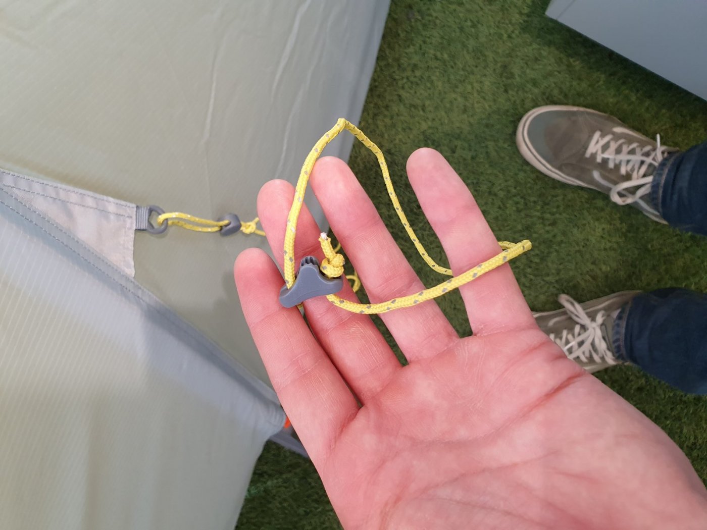 Det er en knapp for stramming ja. Lik slike man har på jakker og sekker, osv. Tenkte først det var bardunstrammere, men det fantes nederst på bardunen. Jeg tror kanskje det kan være for å samle bardunene når teltet pakkes ned. Surrer bardunene i en bunt, puttes i løkka mot teltet, så stram til. Bør fungere hvertfall. Så ikke strikk som pro- og xtremteltene har på dette teltet. Kan det være svaret?