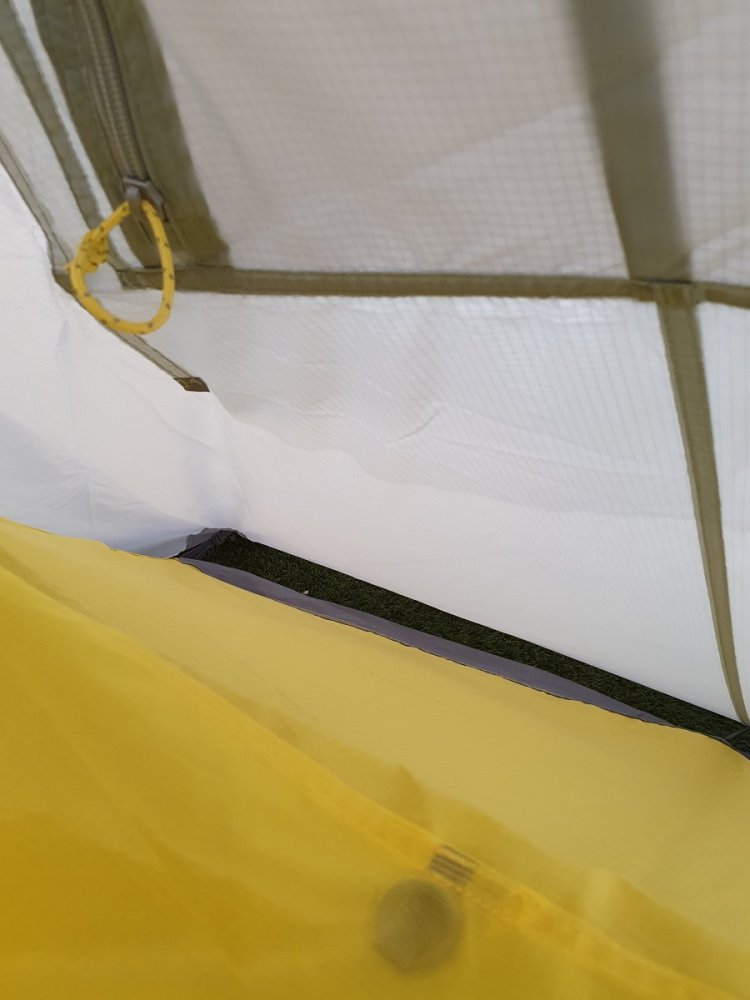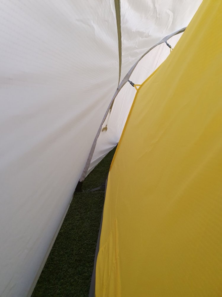Hvis konstruksjonen er likt som mitt SL-telt er innerteltet festet i ytterduken i fotenden. Dvs. at mellomrommet blir mindre og mindre ned mot bakken i fotenden. Kanskje det er konstruert slik? Kjenner ikke til pro-varianter av Fjellheimen-serien o.l.
