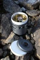 Du må ikkje gløyme at du skal ha med mat, noko å røre med, noko å ete av og med osv. Med stor nok kjele, kan du sjølvsagt få alt nedi, men så stor kjele har du ikkje bruk for. Men slik du skriv, vil det alltid vera noko du kan gløyme att, men så distre trur eg ikkje du er. Med enkle rutiner for å putte alt slik nedi ein pakkpose, kan du likevel sikre at alt er samla på same plass sjølv om det ikkje ligg nedi kjelen. Det finnst mange kokesett med kjele som rommar ein (liten) gassboks og brennar, men dei fleste av desse tilfredstiller ikkje krava dine om stødigheit og vidt flammebilde. Felles for desse er ein liten gassbrennar som monterast på toppen av gassboksen. Dei små gassbrennarane har også veldig konsentrert flamme som fungerer ypperleg til vannkoking men langt dårlegare til steiking. Trangia 25 og 27 har plass til spritbrennaren i kaffekjelen, men raudspritflaska må du pakke utanom. Utan kaffekjele skal det vera plass til gassbrennar i 25-settet, men gassboksane må pakkast utanom. Andre sett med slangebrennar er også laga for å ha brennaren i kjelen, men brenselet utanom. Sjølv har eg greidd å pakke Svea 123r (som har stor nok tank til 1-2 overnattingar) i ein 1-liters kjele, då er det bare å hugse på å ta med mat, fyrstikker og noko å røre med (sjølv har eg også med ei lita flaske med raudsprit til forvarming, men det er ingen krise om eg gløymer den). Det er fyrst og fremst vist som eit eksempel på kva ein kan få til ved å sette saman ting sjølv.