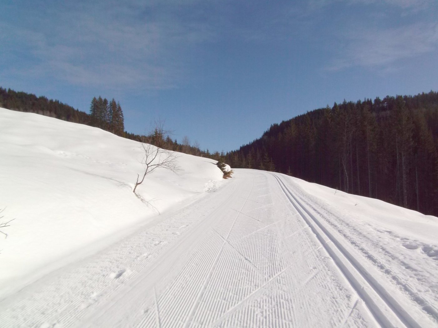 Jeg skjønte litt seint at jeg gjorde en bommert med å ikke ta med meg kameraet i dag, det var jo pent vær og greier. Så jeg gikk fra Stansebakken bussholdeplass i Sørkedalen og ca 10 km opp til Søndre Heggelivann, et område hvor jeg overnattet for ikke så lenge siden. Det tok meg en time fra bussholdeplassen opp til Storebekkbua, og så 90 minutter opp til Søndre Heggelivann, via skiløypa. Jeg lærte i dag at hvis skoa begynner å gnage på føttene, sånn foran over ankelen, så hjelper det 100% å løsne på skolissene på toppen, og vips så er det behagelig å gå igjen uten å ha denne flappen midt på som gnager foran på foten. Og igjen, denne tynne treningsjakka med hette var grei å ha, bare for å kunne ha hetta over hodet, sånn at dette ble en mellomting, mellom det å gå uten noe på hodet, og det å ha på lue. Akkurat passe varmt og akkurat passe svalt. Jeg tok med meg en 0,5 liter flaske med vann, som ble fylt med snø før veien ned tilbake til bussholdeplassen i Skansebakken. Det kunne virke som om at det var mer fugleliv der i skogen nå. En salamander var tydeligvis på vei å krysse den snødekte skogsveien et sted, og ikke så langt unna igjen, så ble det til at en rovfugl seilte ned til veikanten sånn 15m foran meg, og tok seg en gnager. Det var litt piping og så var det stille. Det kunne se ut som om at det var noe i hamsterstørrelsen som den fløy av med, hengende under bena. Ikke greit for meg hva slags fugl dette var, men jeg tror jeg så en stor hvit/grå flekk på siden av hodet. På veien hjem, så hadde jeg med meg en pinne jeg hadde fra der jeg overnattet tidligere, og jeg hadde moro å måle snødybden i skisporet på veien hjem. Rett nedenfor Søndre Heggelivann, så var det sånn 50-65 cm dyp snø i sporet, men litt nedafor, så var det 15-20 cm. Og ned mot og forbi Storebekkbua, så var det sånn 30-40 cm i dybden. Det var på lengre parti hvor det var mer åpent, at det var lite snødybde. En fyr i sporet mente at dette var visstnok siste dag at løypene ble preparert med maskin. Hadde vært flott om noen nå kom å måket skogsveien fri fra snø, så kan skifolka ta seg en bolle i stedet. Jeg fikk prøvd ut Brynje ull netting bekledning, og det var artige saker, likte den godt. Lurer på om det kan være all gåingen den siste tida som har gjort at sømmene på skoa har begynt å løsne. Eller som nevnt tidligere, det kan ha vært bålbrenning som muligens har skylda for at sømmen har revnet, for jeg sparket borti bålet noen ganger for å flytte på vedkubbene husker jeg. Undres hvorfor jeg fikk vondt i ryggen av å gå, da jeg kom meg inn på bussen. Ble kanskje litt monotont, og jeg tok egentlig ingen større pauser under turen. Jeg mista en av vantene som jeg hadde tatt med meg, det var noe billige greier, men søren jeg ville jo beholde dem. Skulle nok ha sett meg litt rundt da jeg tok en drikkepause, før jeg igjen gikk avgårde. Jeg fant litt søppel som jeg tok med tilbake til bussholdeplassen, hvor det finnes en søppeldunk for slikt. En sånn liten gjennomsiktig pose, og en tom boks med ansiktskrem eller noe.