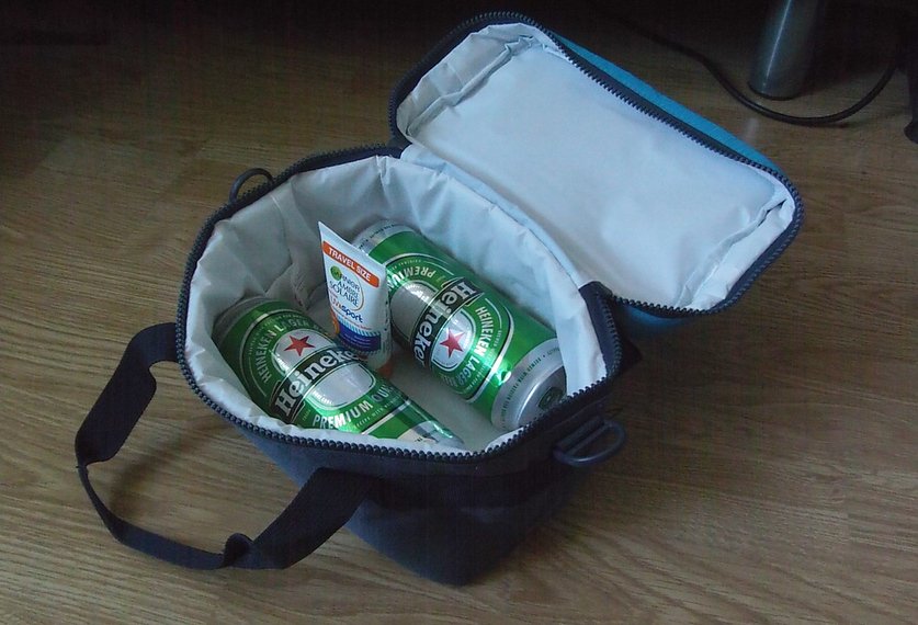 Ok, jeg fikk tak i frosne nakkekoteletter (2kg) på Coop Mega, eller hva det heter. Og så fikk jeg reservert i går, denne kjøleposen, som de ikke hadde i butikk, men som de hadde dagen etter som reservert vare etter "klikk og hent" på nettbutikken til Intersport. Her er et par 0.5 liter ølbokser for å antyde størrelse. Tube solkrem i midten. Er nok ikke plass til ølboksene og nakkekoteletter + pølser, så ølboksene får ligge et annet sted etterhvert. Hmm, eller.. tja, jeg kan muligens få plass til alt, hvis jeg tar pølsene ut av forpakningen.
