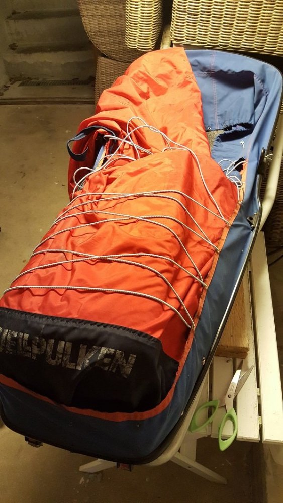 Fikk fatt på en gammel barnepulk fra Fjellpulken for en 500-lapp. Målet var å lage en transportpulk ut av den med plass til mer volum. Gikk til innkjøp av: Maljesett ink. tang (Biltema) og rundstrikk til teltstenger (ca. 200,- totalt). Hadde fra før 2 x solide strammestropper m. klikklås. 1. Først fjernet jeg setet/rygglenet bak og skrudde vekk vindskjermen. Fjernet div. fjærer m. skarpe kanter innvendig. Skrudde av støttearmene på hver side av pulken. Underlag innvendig = et gammelt liggeunderlag tilskjært. 2. Klipte så vekk 90% av det originale trekket, men lot 8-10 cm med "vegg" av stoff langs begge langsidene være igjen. Her passet jeg på å ikke klippe vekk sømmen som var påsydd i skjøten mellom blå og rød del av originalstoffet, for i denne sømmen ville jeg feste maljene for rundstrikken. 2. Festet så maljene med jevne mellomrom i originalsømmen hele veien fra front og tilbake til vindskjermfestene. Tredde i strikken og kryssflettet hele veien. Det gikk med en god del meter med strikk. Brukte bare den gamle strammelåsen til originaltrekket som "endepunkt" på strikken, så strikken kan strammes/låses som man ønsker. 3. Så har jeg bare benyttet selve transportbagen til pulken som nytt "trekk". Den fungerer da helt enkelt som en pose som man legger ned i pulken og innunder strikken, som man fyller opp med ønsket bagasje. Denne transportbagen som fulgte med er i et bevernylon-aktig materiale. Virker veldig solid. 4. Festet så 2x strammereimer med klikklås som går tvers over pulken. Den ene festet jeg rett i vindskjermfestene på hver side. Den andre i de to bakerste skruehullene etter støttearmene. Jeg festet maljer i hullene til strammereimene der hvor mutterne skulle igjennom. Jeg passet på å bruke ganske lange strammereimer, da det er naturlig at bagasjen må bygges litt ekstra i høyden bak i pulken. 5. Og omtrent slik ble det ferdig oppakkede resultatet. Oppi her har jeg alt jeg trenger til 3-4 netter med bålkos og isfiske ink. mat/klær/reinskinn/sovepose/div utstyr osv. Får jeg "Fjellpulken"-logoen til å stå litt mer symmetrisk i front neste gang også, så snakker vi! 😀