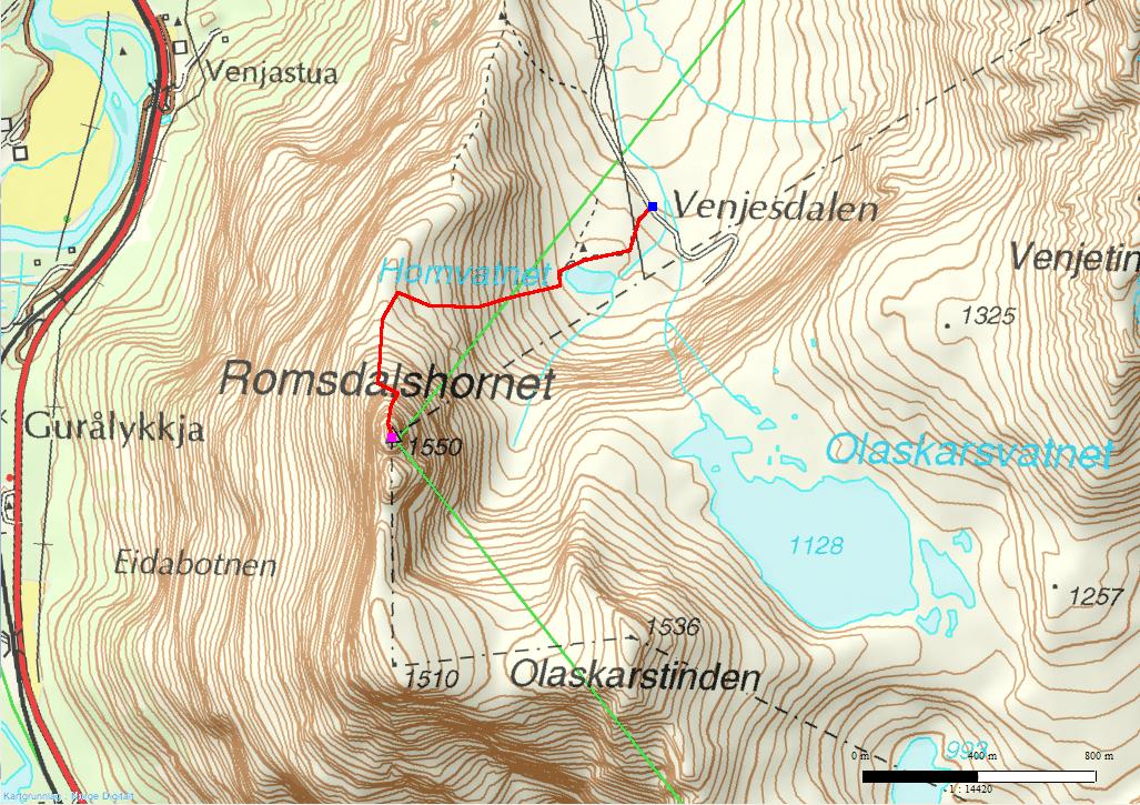Etter 2 solfylte dager i Åndalsnes bestemte vi oss for å ta en siste tur før vi vendte nesa mot Sondres hytte i Stryn. Opprinnelig var planen å ta Kvanndalstind og Vengetind via Drømmediederet (5-) en annen dag, men vi sparte den. Idag var det Romsdalshorn som skulle klatres. Været var sånn passe i forhold til de forrige dagene, men solen skulle vise seg mer mot slutten av dagen. Vi parkerte innerst i vengedalen halv 9 på morgenen, der møtte vi en rekke andre lag. Denne gangen havnet vi først i "køen". Når man parkerer her er anmarsjen til Romsdalshorn frydefult kort men vi kjente det nok begge i bena etter gårsdagens langtur over Store Trolltind. etter ca 1 time sto vi i "gapet", en 2 meter dyp kløft der kongen av Romsdalshorn, Arne Randers Heen er blitt avbildet. link: http://www.frusalen.no/heen.htm ved dette gapet la vi igjen unødvendigheter og tok med det vi trengte for å komme trygt opp og ned nordveggen. Nordveggen består av ca 4 taulengder, men kan korte det ned til 2-3 hvis man er kjent og god til å klyve, eller ta flere dersom man synes de første bakkene til standplassen er ekle. Vi ble fortalt i forveien at de to første taulengdene skulle være bratte, noe som vi synes var spennende. Den første taulengden fikk jeg lede, og det var rett som vi hadde blitt fortalt: her var det bratt, men sikringsmulighetene var det heldigvis greit med så vi storkoste oss. cruxet i første taulengde er vertikalt men også her kan man plassere en liten kamkile i en horisontal sprekk på undersiden, så jeg følte at tryggheten var på min side. Sondre ble sikret opp og ikke lenge etter var han i full fart opp andre taulengde, denne var også bratt og enkelte flytt var også her på 4-tallet. Den tredje taulengden bestod mer av 3er-klyveklatring, samt en sprekk som man må dytte seg opp. Ellers var det stort sett grei skuring opp til toppen, men vi fikk høre at vi hadde klatret den siste taulengden opp rappelruta! heldigvis møtte vi bare én gjeng på vei ned og vi fikk ingen stein i hodet. På toppen blåste det litt og vi så oss rundt, her var det store varder, sikkert 2-3 meter høye og en hytte, tilhørende Arne Randers Heen, hvis jeg ikke tar feil er det vel frakken hans som henger der fortsatt? vi ble ikke lenge, vi skulle jo til Stryn så vi startet å rappellere ned Nordveggen (ha med 2*60m tau!). Når vi skulle finne de siste boltene ble vi overasket over at den veien som så mest iøyenfallende ut var svært utsatt , omtrent som å bevege seg på kanten av en skyskraper følte vi! og rappellfestet var ved den tidligere nevnte sprekk, bestod av en heks og en bolt og to karabinere. Uansett, vi tok en lang rappell ned og trasket tilbake til bilen etter å ha vært 7,5 timer på tur. Deretter tok vi et velfortjent bad i Vengedalsvatnet. Veien videre til stryn var fin da den bevegde seg gjennom fjorder og fjell, men jeg sovnet som en stein etterhvert.