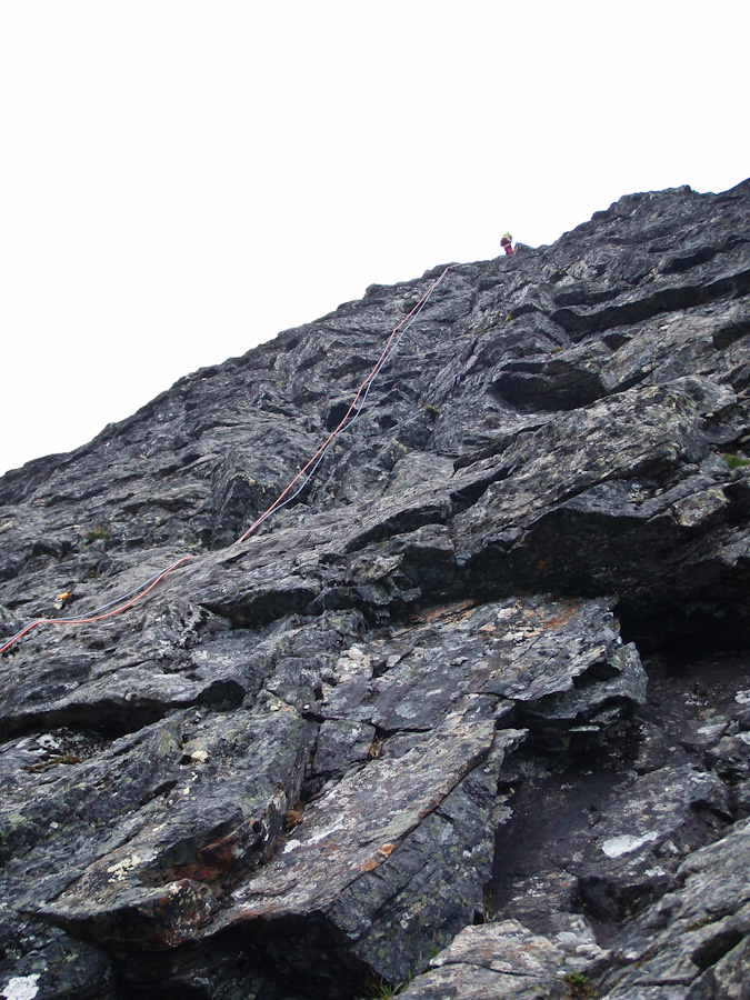 Klatringa opp eggen var ikke mye å ta bilde av, var i det hele tatt kun et parti som var "bratt" og der var det heller ikke passende å ta et bilde. Det er ikke klatringen som gjør denne ruten interessant, men omgivelsene. Ruten er fin til å øve på flertaulengdersruter, men for de som tar turen til romsdalen vil jeg heller anbefale nordveggen på romsdalshorn eller østeggen på Bispen(her har jeg ikke gått, men denne har blitt skrytt mye av). -