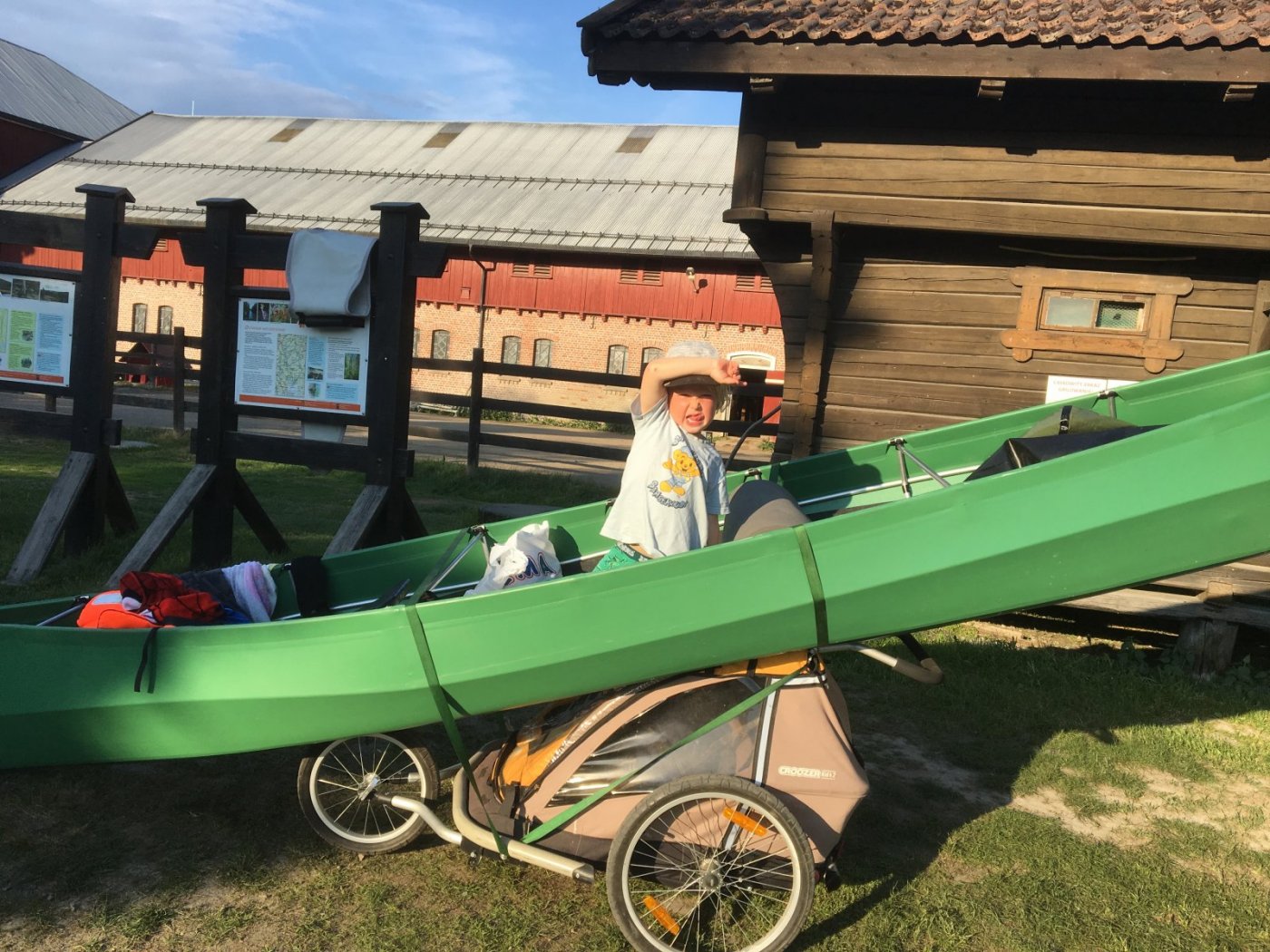Nød lærer naken ... osv, og med nyanskaffet kano og en plutselig trang til tur, måtte mangel på tralle løses! Resultatet ble sykkelvogna. Funket helt utmerket. Kanoen lot seg trille med en hånd t/r Losby - Mønevann. Mesteparten av baggasje la jeg i vogna, mens jr fikk sitte oppi. Framhjulet på vogna var ikke ned i bakken ved trilling, men støttet oppunder kanoen.