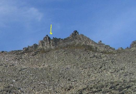 Hvor står det..????? Har det kommet mer utfyllende beskrivelser i senere utgaver??? (jeg har første utgave) Neeeeei......eller...... Har tatt et utsnitt av et bilde. Skaret er kanskje det som jeg har satt blå pil på? Jeg kom opp på gul strek, og de 2 korte under tinden er mine forsøk. Jeg gikk ikke over på motsatt side pga jeg var sikker på at den andre var den høyeste. Rød strek er oppgangen i østsida. Det er mulig det gikk an å gå inn i vestsida av tinden. Jeg kikka ikke etter. Var på vestsida av den til venstre. Rett nord for denne var der ei bratt renne med såpeglatte sva. Dette må stemme. Bildet i fotturboka er tatt fra nabben til venstre for det lille skaret. Det er duket for ny tur i området..