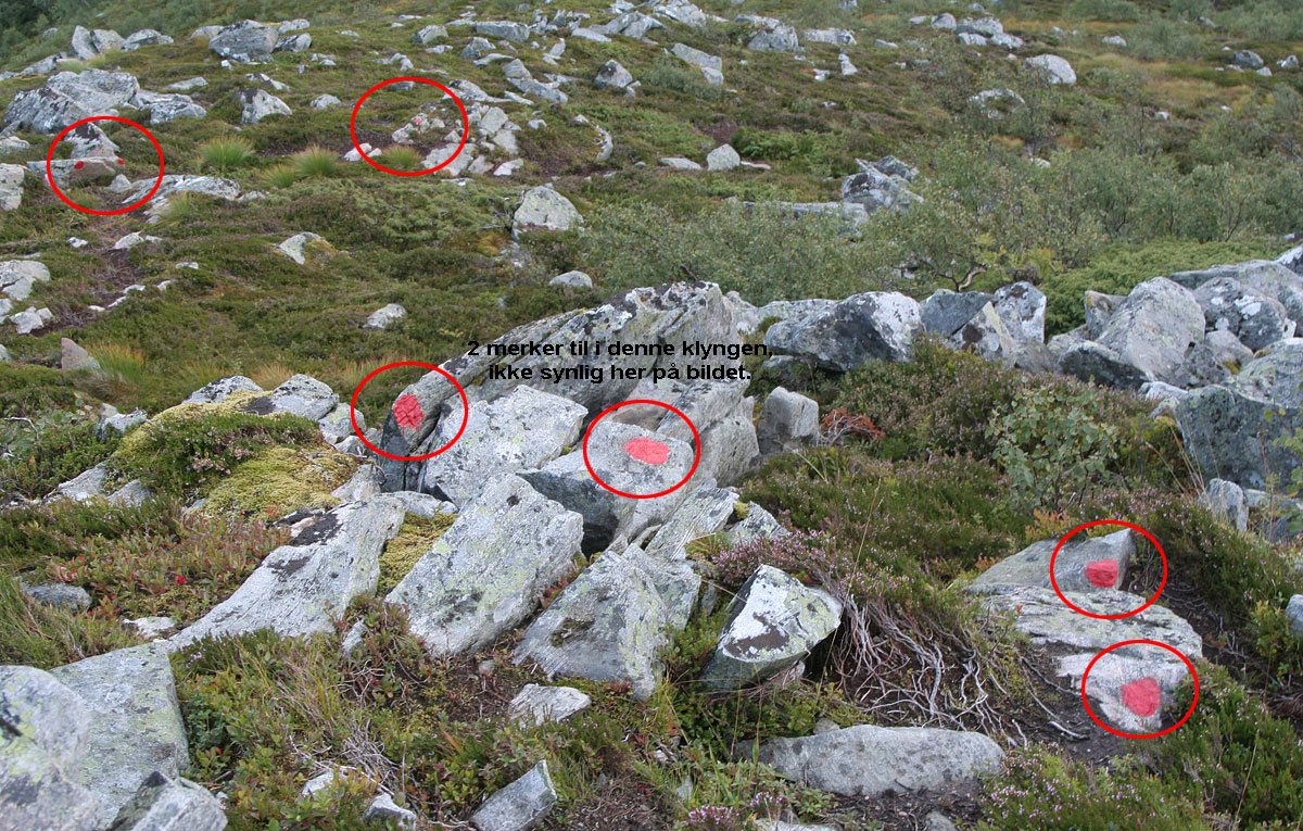 9. Jeg er ikke den som protesterer mest på merking av stier, noe merking kan ofte komme godt med. Bl.a satte jeg pris på det i skumringen på en svakt synlig sti på returen. I går kveld gikk jeg på et sted som uten tvil er det desidert mest merkede jeg noen gang har gått. Storhornet (584) i Haram på Sunnmørskysten, jeg gikk ned sørvestryggen av dette fjellet. Jeg hadde ikke gått mer enn 20m ned fra toppen før jeg skjønte at dette var en smule spesielt. Derfor gikk jeg opp igjen og begynte å telle antall merker, røde malingsmerker med diameter 5-10cm. Bare for å ha nevnt det, stien var tydelig/enkel å følge og terrenget slik at man mer eller mindre kunne gå der en ønsket. Fjellryggen er 275 høydemeter fra skar til topp, jeg telte 142 røde merker. Jeg gikk ALDRI mer enn 15m før jeg traff på et nytt merke, noen steder fant jeg 6-7 merker innenfor en distanse på 5 meter. En merket sti på denne fjellryggen hadde mer enn nok klart seg med 8-10 strategisk plasserte merker, 4-5 stk i nedre del (litt skog) og 4-5 stk i øvre del (tydelig sti, snaufjell). Intensjonen til de som står bak er sikkert god, men jeg forstår ikke hvorfor det skal være nødvendig å klatte så mye utover som i dette tilfellet. I dette bildet er det 7 synlige prikker + 2 som ligger i samme klynge som de 4 nærmeste.