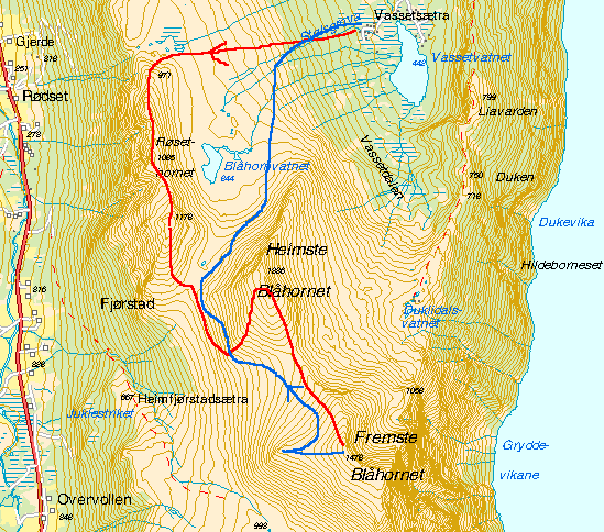 Jeg og Geir ble tidligere i uka enige om å prøve å få til en tur til Blåhorna øst for Strandadalen hvis været tegnet å bli bra. Torsdag kveld var det liten tvil om at fredag skulle bli beste muligheten, og vi avtalte å møtes på fergekaia på Stranda fredag morgen. Siden levering av barn i barnehage sto på morgenprogrammet, møttes vi først kl. 09.45. Det var lett skydekke som forhåpentligvis ville lette enda mer, slik meterologene hadde lovt oss på forhånd. Det skulle bli godt å komme seg opp i høyden igjen. Turmålet Dagens topper skulle bli Røsethornet (1085), Løfonnfjellet (1178), Heimste Blåhorn (1352) og Fremste Blåhorn (1478). 1450-1500 høydemetre totalt. Geir hadde ymtet frampå om å prøve nordryggen av Heimste Blåhornet, og sms'n kvelden før lød "tar med stegjern og isøks". Returen hadde vil blinket ut i østsida av Fremste Blåhornet, bort i mot 1000 sammenhengende nedkjøringsmetre med, på kartet, fin nedkjøring. Ei sommerrute opp fra Vasset går opp langs denne sida. Adkomsten Vi kjørte til Opshaugvik og fant etter litt feilkjøring grusveien som går opp til sætrene ved Vassetvatnet. Ei lita snøfonn sperra veien helt oppe, så vi parkerte og gikk de 3-400m bort til Vassetsætra hvor vi kunne spenne på oss skiene. I grovkornet og våt snø gikk vi i slakt terreng opp den åpne skogen med nordryggen av Heimste Blåhornet til venstre for oss. Vi hadde sett på ryggen med kikkert, og skavler i toppartiet skulle kunne være mulig å passere. Jeg hadde mest lyst også å få med meg Røsethornet og topp 1178, som jeg i dag har fått vite at heter Løfonnfjellet. Det ble derfor til at vi gikk opp nord for Blåhornvatnet og inn på nordryggen av Røsethornet. Røsethornet og Løfonnfjellet Ryggen mot Røsethornet var relativt lettgått på oppblåste skavler. Vi finner en varde på kanten mot Strandadalen, noen meter nedenfor høyeste toppen. Vi sklir videre ned i skaret mot Løfonnfjellet, mens vi betrakter en stor tverrgående skavel. En mulig oppgang kunne vært til høyre, klyving på tørt underlag, men vi velger på venstre side. Skavlen har ei 3-4m bred hylle som vi skrår opp langs. Geir prøver seg på de siste 6-7 meterne med ski på beina, men det blir for bratt. Prøver å ta av ene skia å sparke trinn i skaren, men det er for hardt. Går noen meter tilbake og prøver igjen, og han kommer seg over. Jeg har halveis begynt å leite fram stegjern, men snurrer igjen sekken og følger etter. Jeg sonderer etter gode fotomotiver, knipser litt og vi tar matpause på toppen. Været varierer, det er fortsatt overskyet. Noen mørke skyer kommer og går, det samme gjør solen. Men mest på nabotoppene Blåhorna I dels flatt lys kjører vi ned i skaret mot Heimste Blåhornet. Opp vestsida er bratt, sikkert med skare, så vi velger å runde inn i sør/sørvestsida og følge denne til topps. Geir går jevnt foran med meg slitende et stykke bak. Etter knappe 400 høydemetre fra skaret mot Løfonnfjellet, når vi toppen. Nå kommer de første tåkeskyene sakte glidende inn og legger seg forsiktig rundt toppen. Noen snøfnugg merkes også. Vi burde nå ha flott utsikt mot Storfjorden og ruta videre mot siste toppen, Fremste Blåhornet, men nei. Etter å ha kjørt ned den slake sørryggen legger vi på fellene for siste gang. Jeg tar fram mobilen for å sende en sms-beskjed, og får samtidig en selv: "Sitter på toppen av store ringstind, sol, vindstille og blå himmel. Kan livet blir bedre?". Jeg er et øyeblikk misunnelig på Torgeir som sendte meldingen, og returnerer "tåkeskyer og dårlig sikt her, men bra føre".... De som valgte Hurrungane tors-fre-lør hadde gjort et godt valg. Geir har gått i forveien for å lete etter muligheter for å passere skavlene i østsida (returen). Jeg går etter, og han har funnet et sted hvor skavelen er bratt men ikke overhengende. Men sikten er dårlig og lyset flatt. Vi går til topps på Fremste Blåhornet, og ser at noen kilometer lenger sør er det sol og finevær, men det kan vi uheldigvis lite gjøre med. Det er ingen vind som kan sette fart i skydekket. På toppen står en teknisk installasjon, ser ut som en mottaker av etter eller annet slag. Vi tar ei pause og vurderer å vente for å se om det blir lettere. Det begynner å snø igjen, og sikten er dårligere enn noen gang. Det blir rask retur ned fjellet, men først sklir vi utom ryggen som leder ut mot vest. En varde står på kanten og det er flott utsikt ned mot Strandadalen. Kunne i alle fall vært det. Vi legger i vei videre nedover, og returen legges ned langs Blåhornvatnet. Det går vel ikke mer enn en halvtime, så merker vi at vinden har begynt å tilta. Ikke lenge etter var det sol og finevær. Var det noen som sa fredag den trettende En bilderapport er lagt ut på http://www.tinderangling.net/info/Bilder/Sunnmorsalpebilder.htm Har laget et kart som viser ruta.
