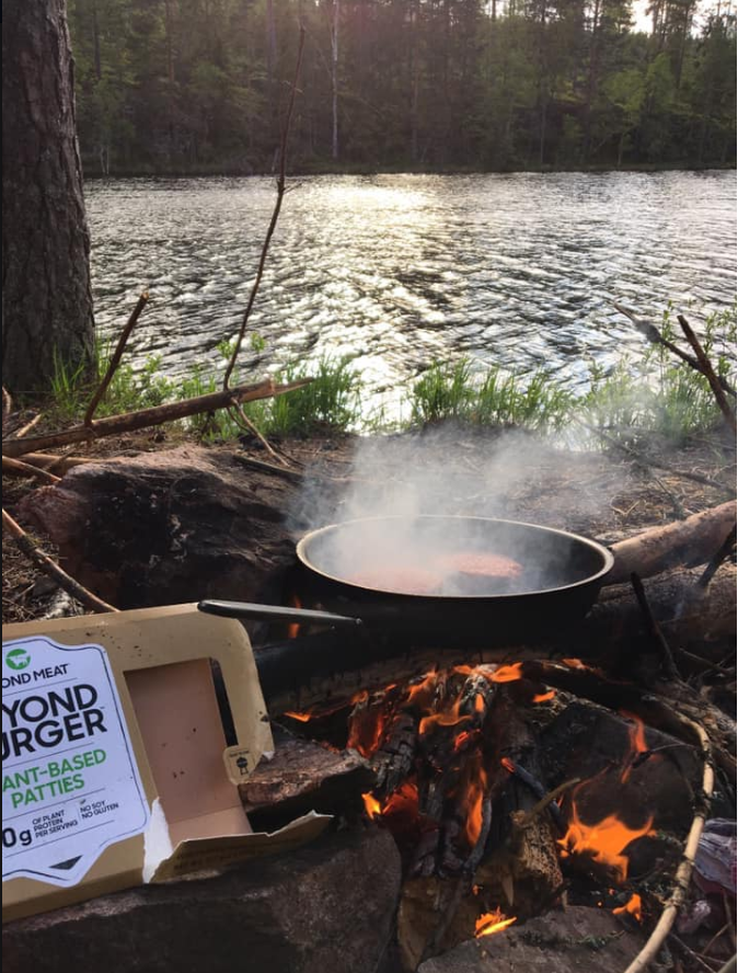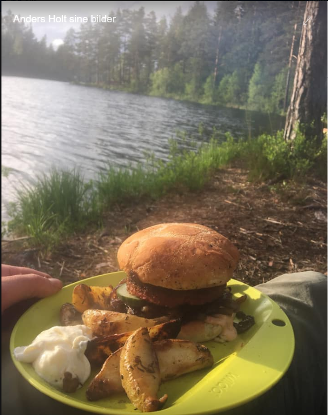 En annen ting som er rådigg på bålet: Beyondburger, sautert rødløk og frisk agurk, med rosmarinstekte potetbåter og vegansk aoili. Kjenner savnet etter sesongen kommer krypende nå