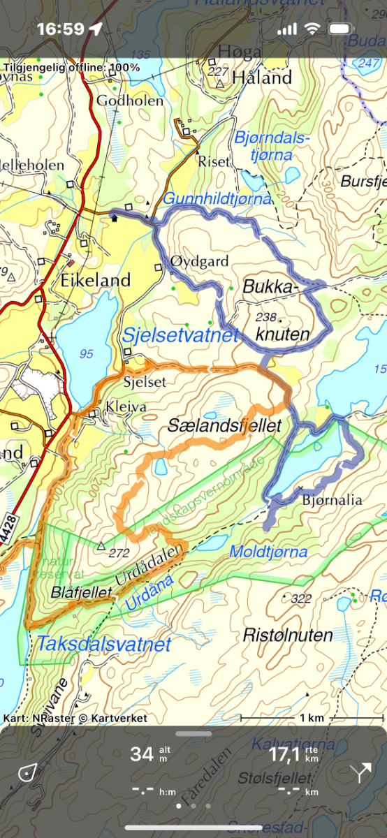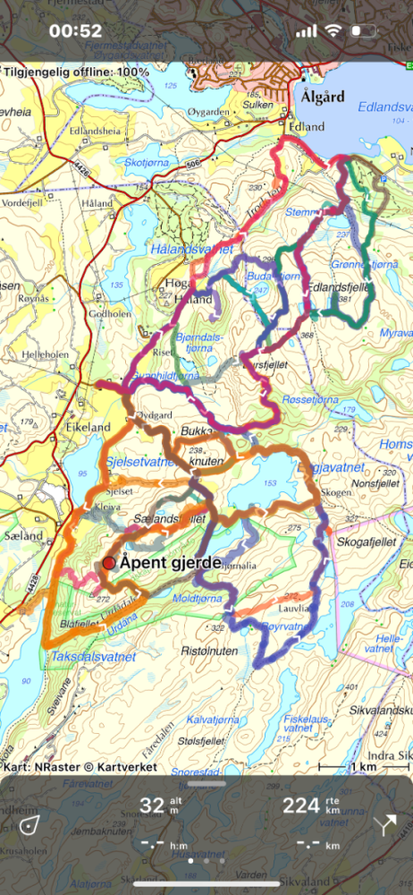 Ligger litt bakpå med turrapport her.. har enda ikke gått den røde streken i forrige post.. men i oktober fikk jeg fyllt opp kartet. Gikk bakkene ned mot sjelset som jeg manglet - og så har jeg og gått rundt vannet fra bjødnalia. Var sti i starten fra bjødnalia men på et punkt valgte jeg nok feil og kom inn på et sauetråkk så måtte brøyte meg gjennom ganske mye einer.. på et punkt kjente jeg at jeg ikke gadd å snu så klarte å finne veien gjennom men anbefales vel ikke. Så her de 2 nye rutene og det totale rutenettet jeg har gått i området (+ et par bilder fra turene).