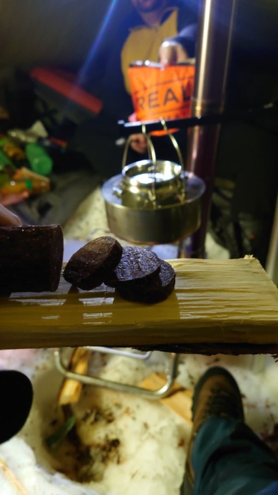 Risten var i bruk hele oppholdet. Men blir fortsatt ganske hot under. Det skal sies at jeg har bare de korte bena på ovnen Richard la ut bilde av så det ville gjerne blitt bedre med lange ben. Da ville ovnen kommet tre ganger høyere opp. Vi lå en stund på denne lokasjonen så snøen under ovnen fikk god tid på seg til å smelte. Forøvrig er jeg misfornøyd med at når turfølge først knipser bilde av mann som sover så er ikke mann som sover med i bildet 😂🤔 -