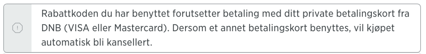 Ny runde med tilbud, siste dag i dag 19/3. La inn rabattkoden ved utsjekk av handlekurven, og da kom denne meldingen om at DNB VISA/MC må benyttes for å få rabatten