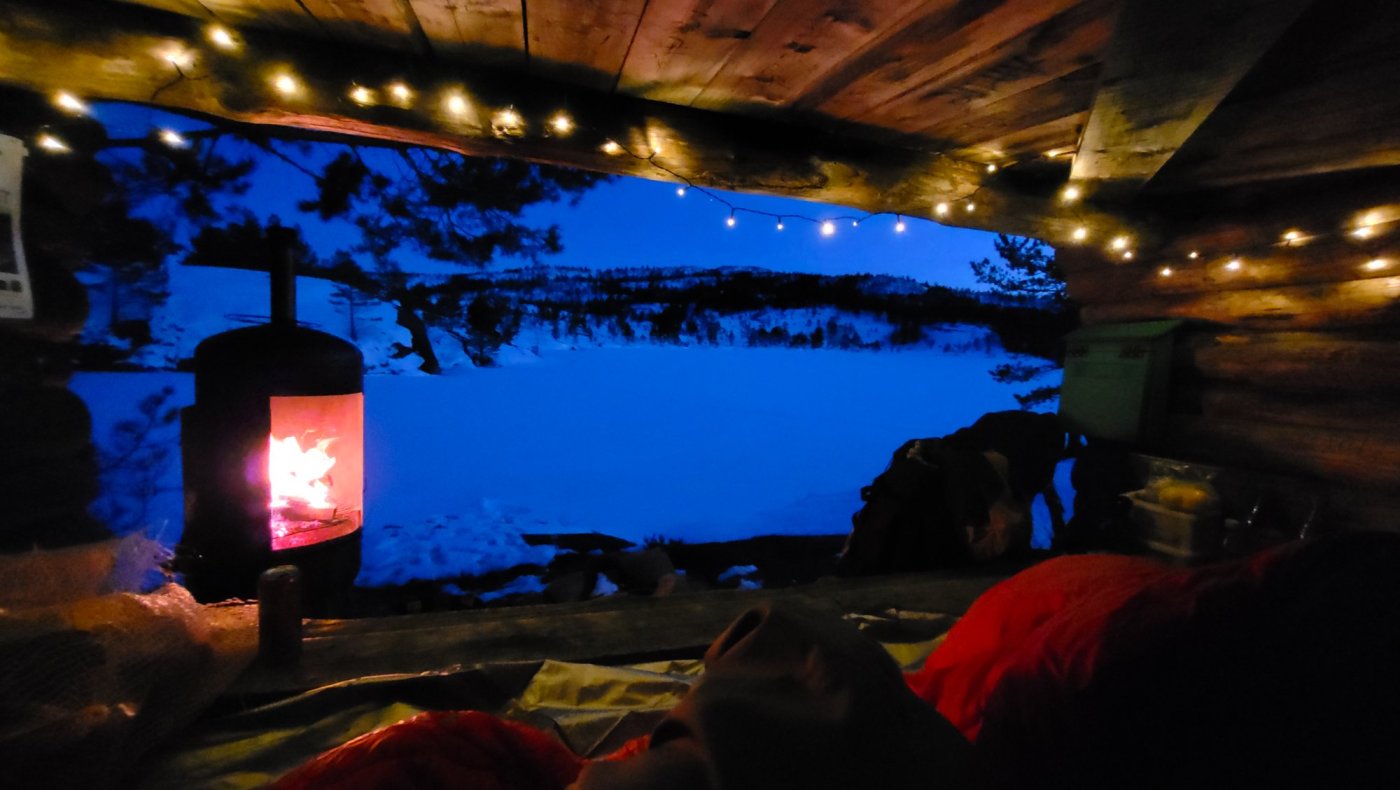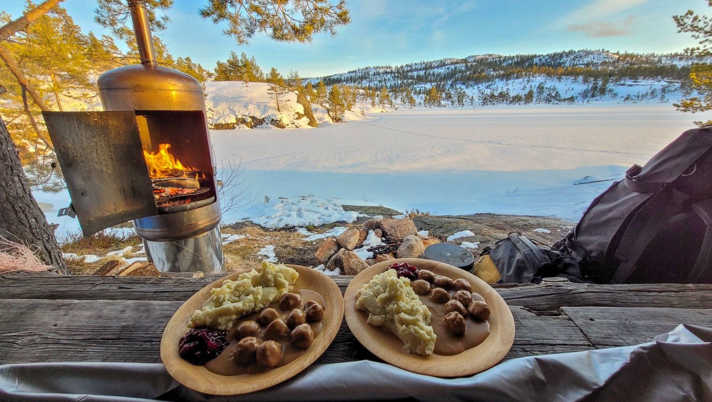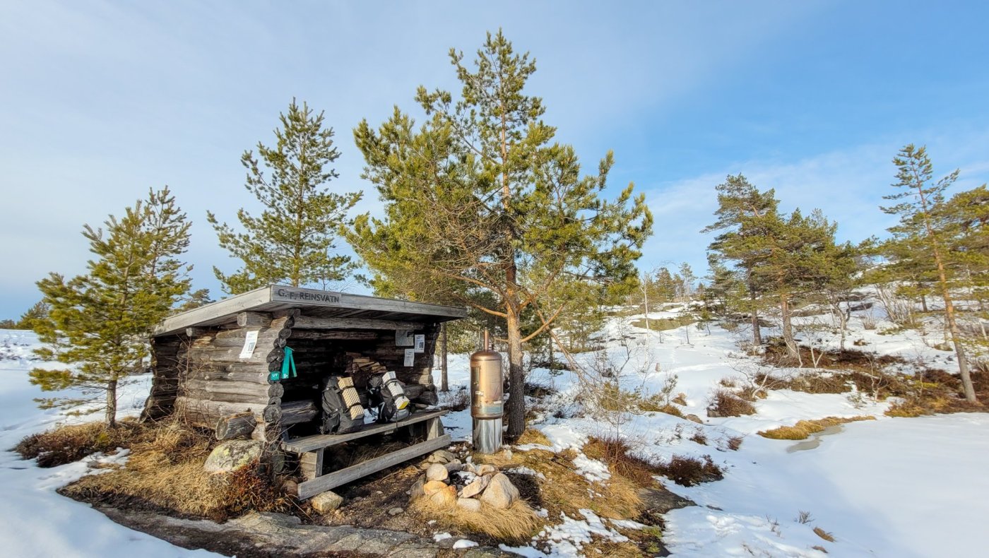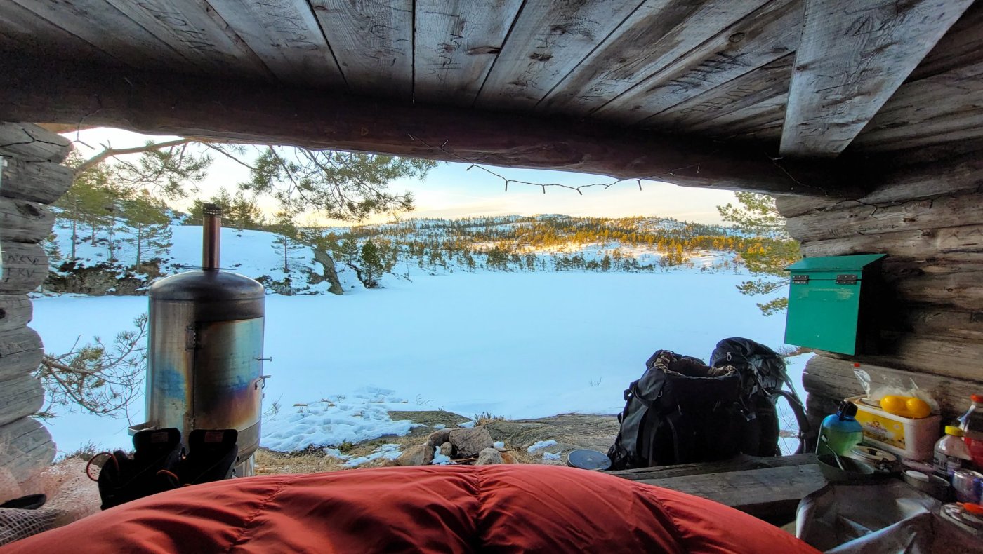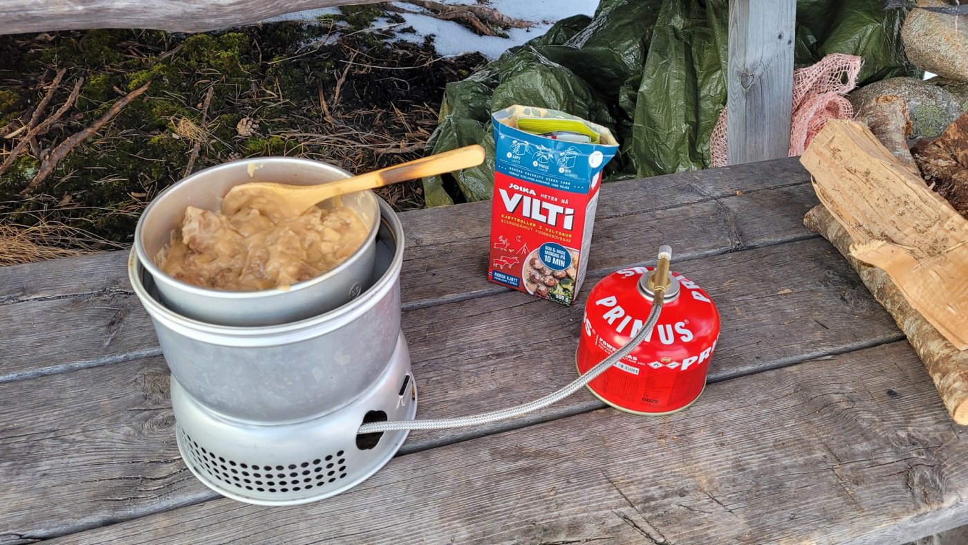 Overnattingstur på Gautefall i gapahuk (Lørdag 15. - Søndag 16. mars). Planen var egentlig hengekøyetur ved Stolsvassnuten, men når Yr melder 15ms vindkast hele natta, var ikke valget vanskelig når gapahuken står der i le for vinden, og var ledig. Føret var ganske bra, hardpakket frossen gammel snø med 5-10cm nysnø på toppen. Så trugene ble liggende i bilen. Kaldeste temp på natta ble 2,2 kuldegrader et par timer, før det begynte å stige til over 0 på morgenen. Ganske kjekk tur, selv om den ikke var så lang - 9 km totalt. Lørdag: Viktig med nok proviant Kjekt å kunne fyre litt i ovnen som var der, det hjalp godt på temperaturen når man satt i åpningen av gapahuken. Middagen er servert - Vilti kjøttboller i saus med potetmos og tyttebærsyltetøy. Enkelt, men godt! Søndag: Morgensol Frokost. Snøen smelter og vannet renner i bekkene - våren er på vei.