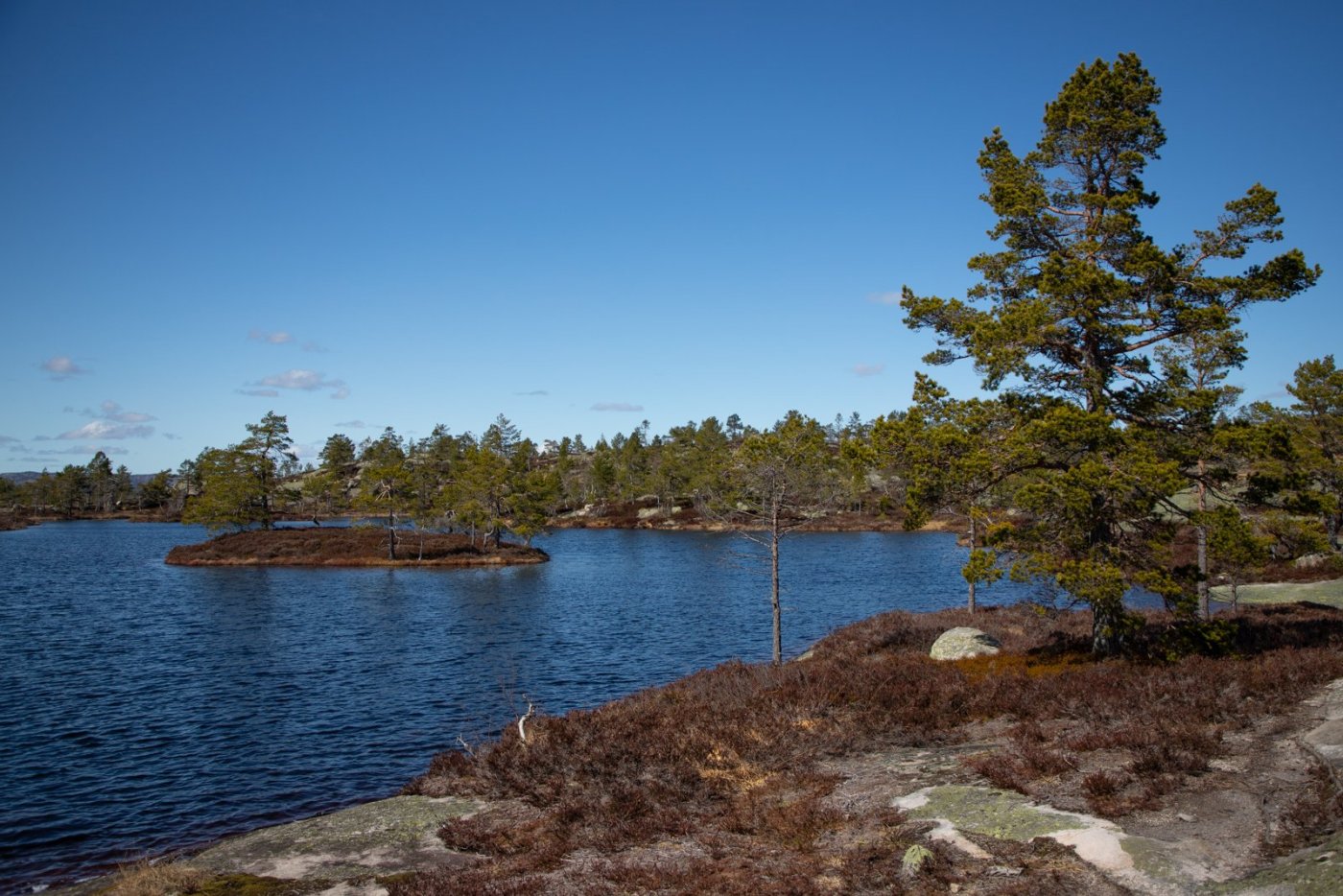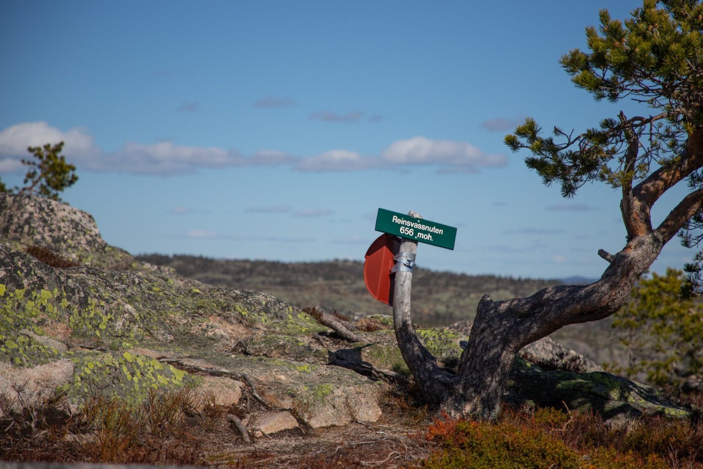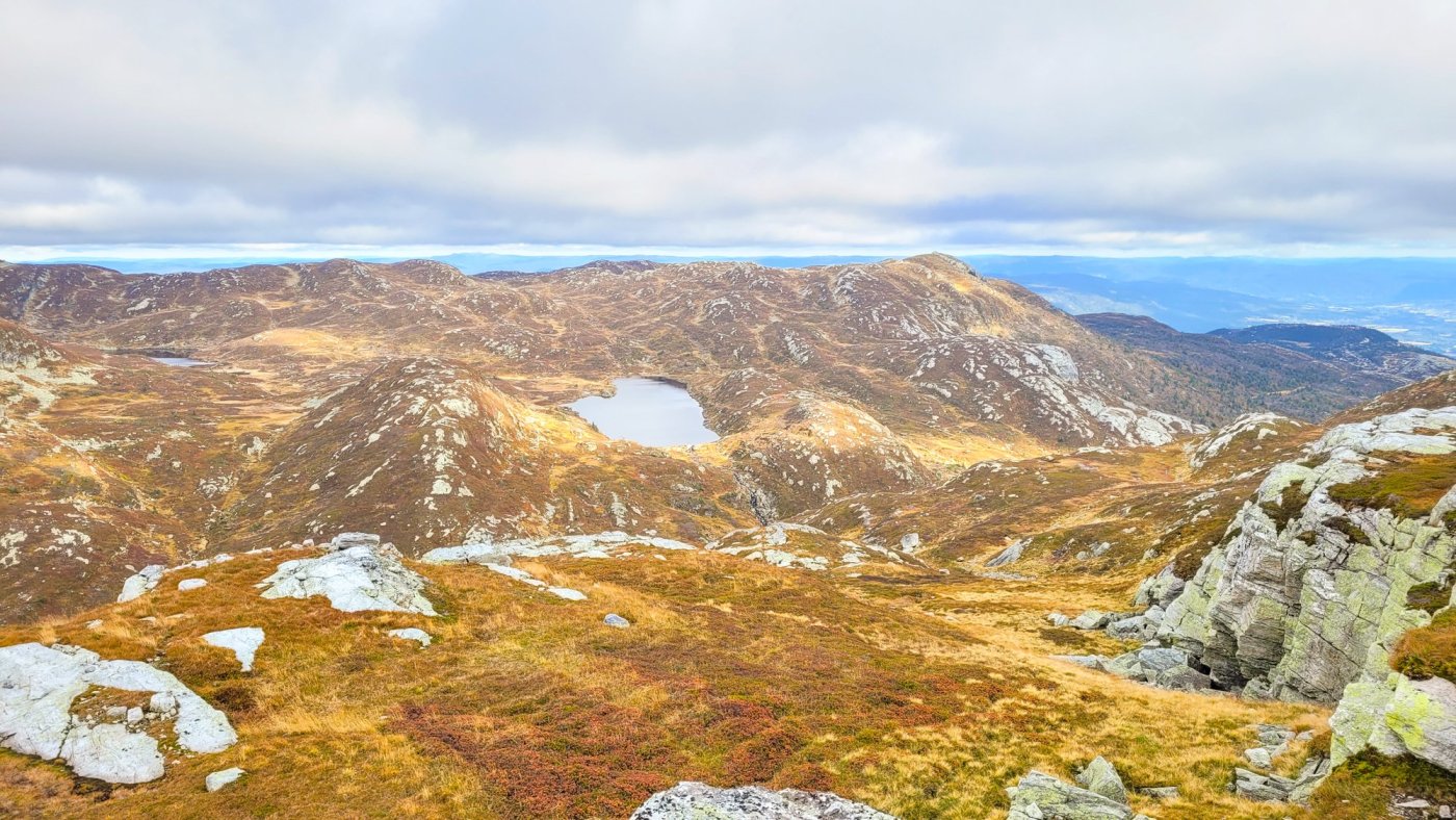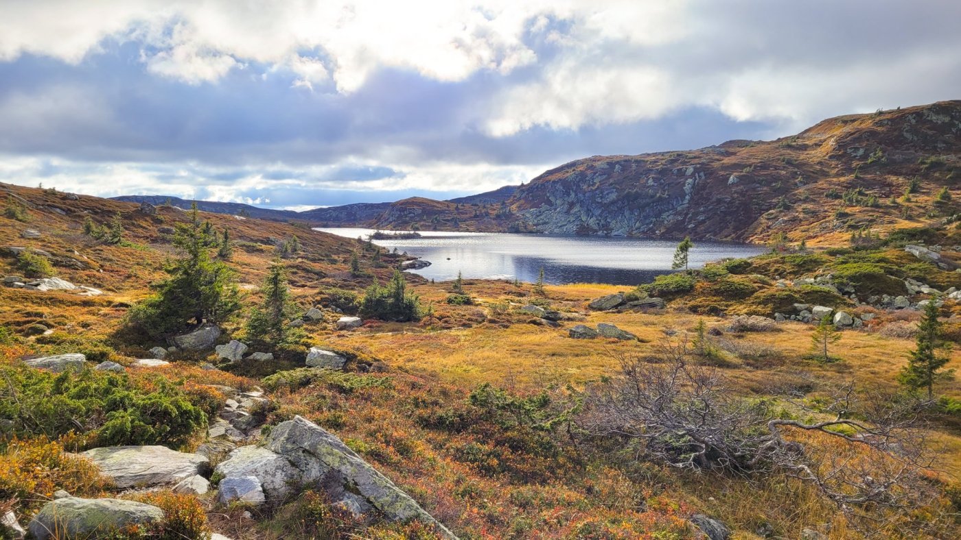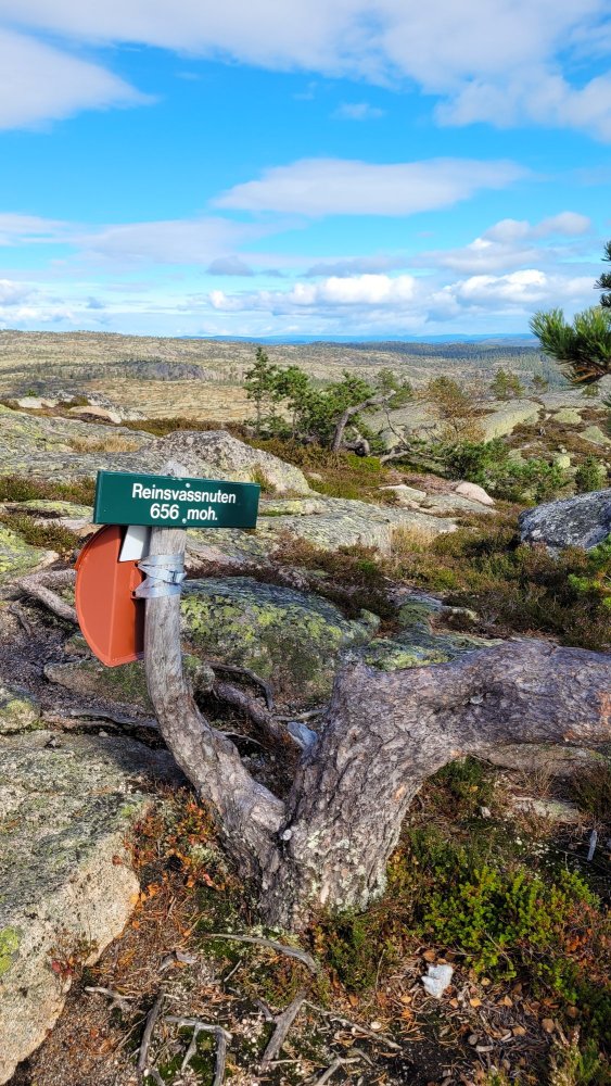 Søndagstur på Gautefall - 21. september. Kombinerte to av "løypene" jeg har gått enkeltvis der oppe denne dagen, så ble lang tur, da man hadde god tid. Satt og av tid til litt avslapping, ro og middag. 6,5 t / 25km. Første tur og test av ny dagstursekk. Kjekt med sekk med hoftebelte, når man skal gå fort og langt med litt vekt i sekken over tid. De to andre dagstursekkene, på 9l og 15l, uten hoftebelte merkes godt på nakke og skuldre etter en del timer på tur om de veier litt for mye. Denne på 26l passer perfekt til dager der man må både kunne pakke genser og jakke, slik som på senhøsten, samt ha plass til utstyr for å lage mat. Reinsvatn og Reinsvassnuten i bakgrunnen:
