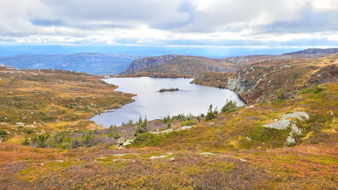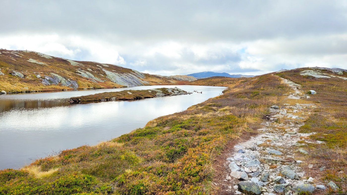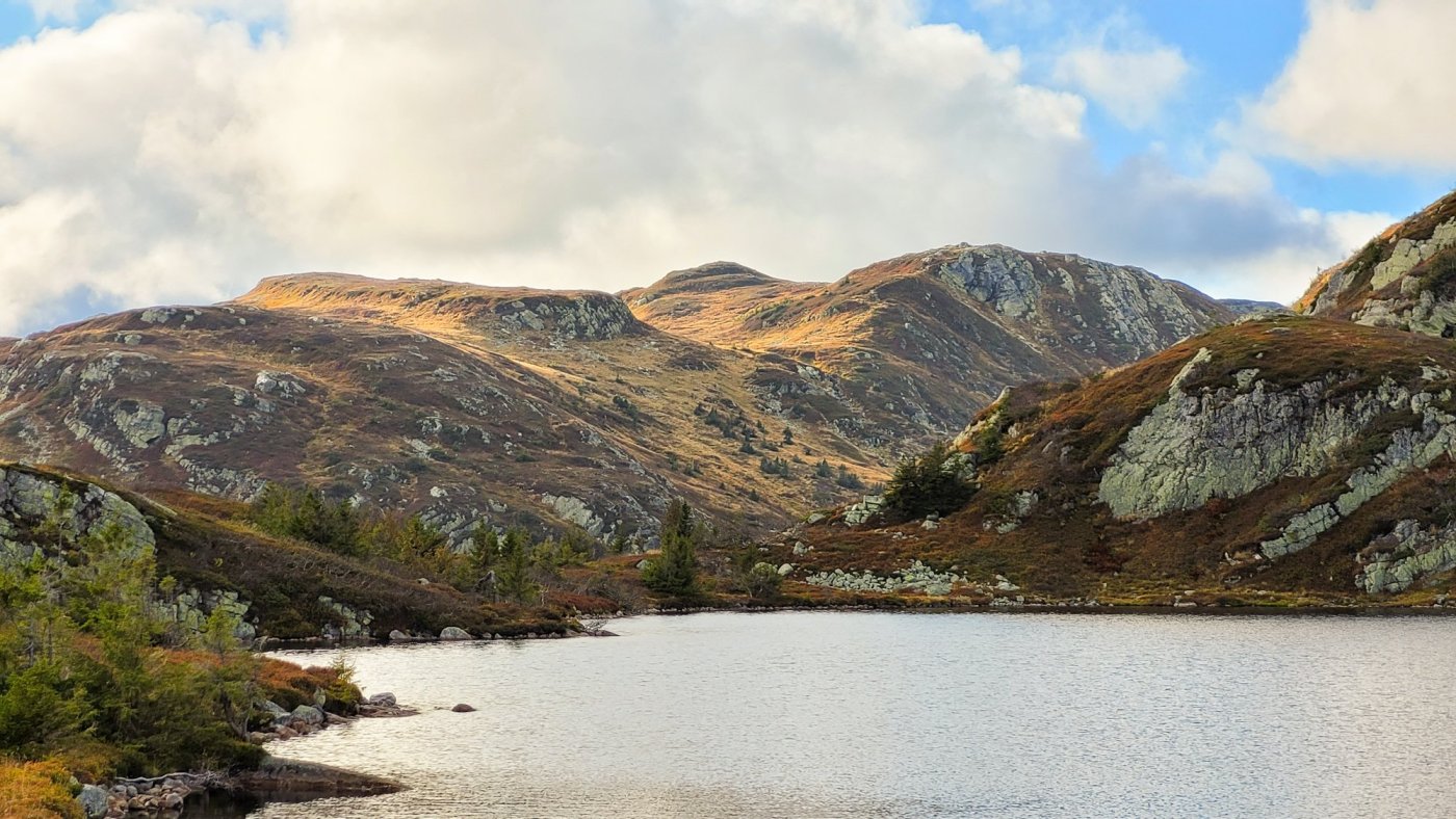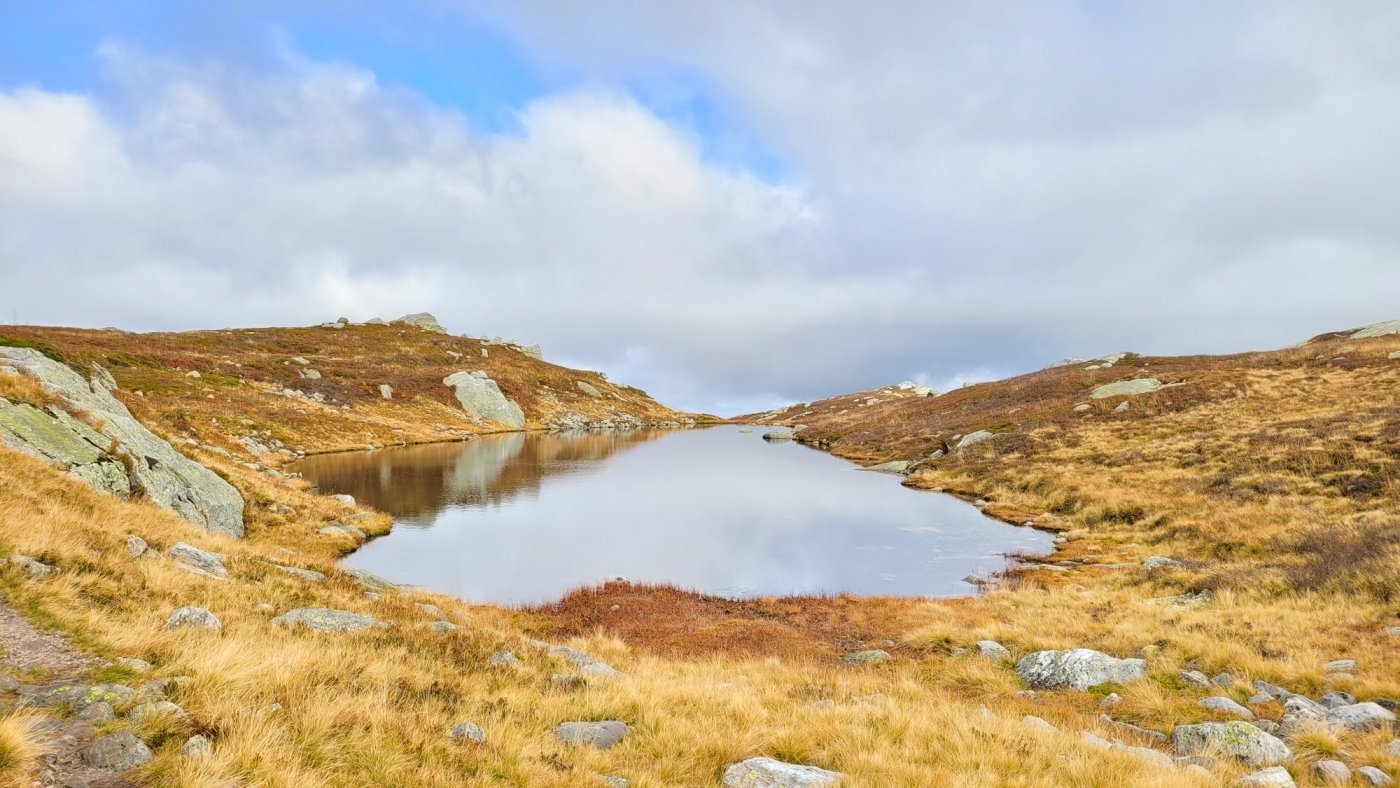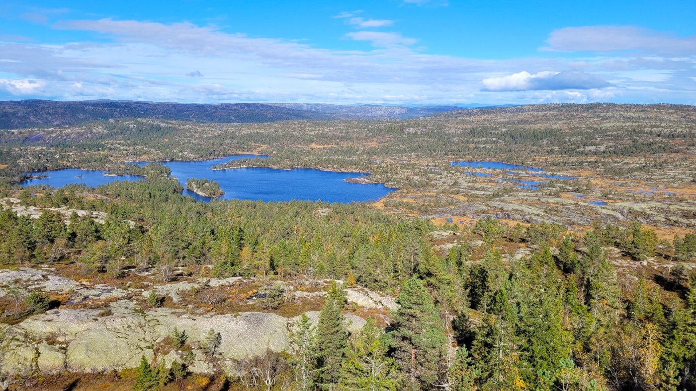Søndagstur på Gautefall - 21. september. Kombinerte to av "løypene" jeg har gått enkeltvis der oppe denne dagen, så ble lang tur, da man hadde god tid. Satt og av tid til litt avslapping, ro og middag. 6,5 t / 25km. Første tur og test av ny dagstursekk. Kjekt med sekk med hoftebelte, når man skal gå fort og langt med litt vekt i sekken over tid. De to andre dagstursekkene, på 9l og 15l, uten hoftebelte merkes godt på nakke og skuldre etter en del timer på tur om de veier litt for mye. Denne på 26l passer perfekt til dager der man må både kunne pakke genser og jakke, slik som på senhøsten, samt ha plass til utstyr for å lage mat. Reinsvatn og Reinsvassnuten i bakgrunnen: