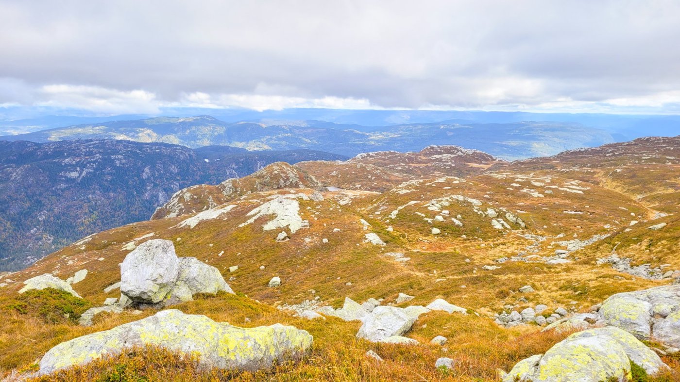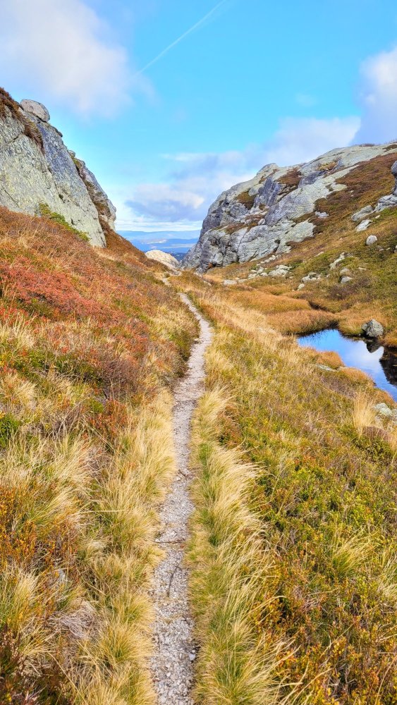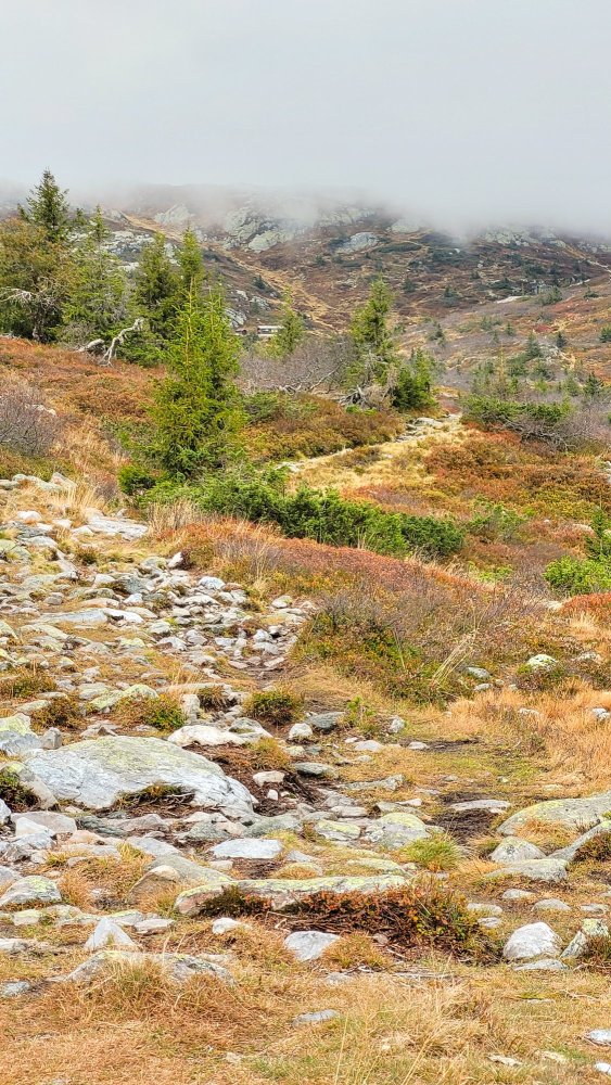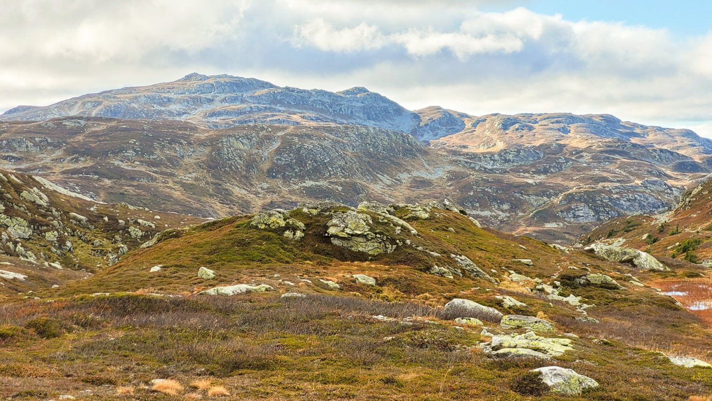 Dagstur på Lifjell - Lørdag 28. september: Var lavtskydekke og en del vind når jeg startet turen ved Jønnbu, men lettet utover turen og vinden roet seg litt. Ble en god høsttur, og forhåpentligvis ikke den siste for i år... På vei mot Øysteinnatten På vei ned fra Øystennatten og på vei mot Skardtjønn. Denne dagen gikk jeg på baksiden av eggen ned fra Øysteinnatten pga vinden. Er ganske fint å gå her nede også, og man oppdager flere mulige teltplasser. På vei opp i høyden fra Skardtjønn, og ser ned Oksladalen og Langetjønn: Utsikt over mot Sandtjønn: Mot Jøronnatten: Klokkesteinstjønn: Noen etternølere som ikke vil ned fra fjellet.. En liten snarvisitt innom Falkefjell før man begynner turen ned mot Nybu og tilbake mot bilen... Store stein som er delt er gøy, og her ser man faktisk to, den jeg står med, og den som er lenger bak Nede ved Nybu: Oppover Oksladalen: