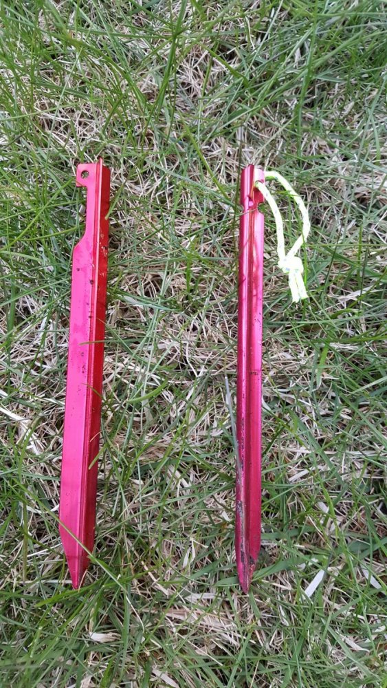 Da har jeg hatt dette teltet oppslått på plenen i noen dager, i finvær og lite vind. (Så det er ikke blitt skikkelig testet ennå. Har heller ikke overnattet i det, men jeg drar forhåpentligvis på tur snart.) Romslig telt som det er enkelt å sette opp og demontere alene, men pluggene er vanskelige å trekke opp, pga utformingen og fraværende hemper. (Jeg brukte derfor Leatherman for å dra dem opp av jorda.) Jeg legger ved noen bilder og noen tilhørende spørsmål. På bilde nr. 1 er en Sarek-plugg til venstre, og en billig og lett NatureHike-plugg til høyre. Sistnevnte er også av aluminium og av grei kvalitet, så vidt jeg vet. Testet på høyfjell noen ganger, også i sterk vind. Praktisk hempe montert fra før. På bilde nr. 2 er Sarek-plugger sammen med en Bergans HeliumDome-plugg øverst. Denne er også lagd av lett aluminium, og jeg har testet den i sterk vind. Spørsmålet mitt er hva slags plugger jeg bør ta med meg på høyfjellet? Har rikelig av HeliumDome-pluggene. Kan selvsagt også enkelt montere noen hemper på Sarekpluggene, men magefølelsen sier meg at jeg bør satse på HeliumDome-pluggene, selv om de kanskje tar større plass og veier litt mer. Riktig? Og hva ekstra barduner angår: Er det bare å kjøpe flaggsnor på Clas Ohlson f.x.? Ser de også selger silikonspray, og har forstått at denne kan brukes til impregnering av teltduk når duken, etter mye bruk, slites ned?