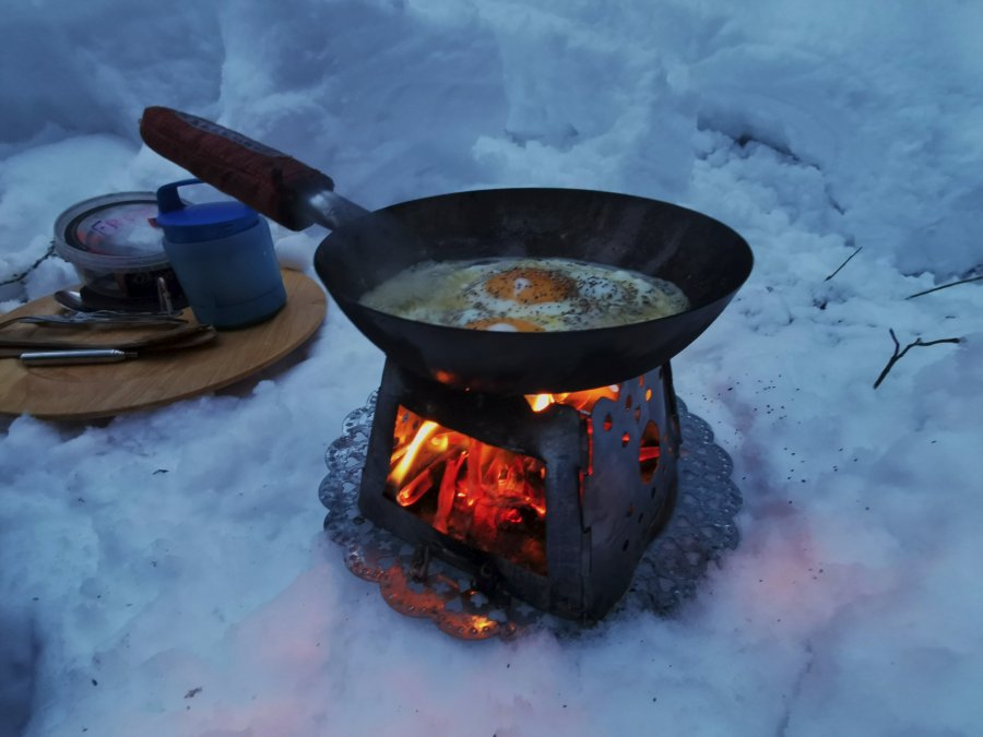 Jeg bruker ei standard stålpanne som jeg behandler med matolje og varme for å få et supert anti-stick-belegg. Dessverre vet jeg ikke hvor man får tak i denne lenger, men det er ei helt enkel standard stålpanne av enkleste og billigste slag. Jeg vasker den ved å koke den ut etter bruk. Vanligvis holder det da å bruke en enkel svamp. Jeg bruker ikke såpe. Med ujevne mellomrom har jeg i litt matolje og fornyer belegget ved å varme den opp til det ryker, tørke av det overflødige (forsiktig, varmt!) og la panna avkjøle seg før jeg pakker den ned. Da er den klar til bruk. Panna bruker jeg på alle mulige varmekilder, rødsprit, gass, primus, bål...