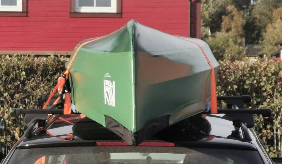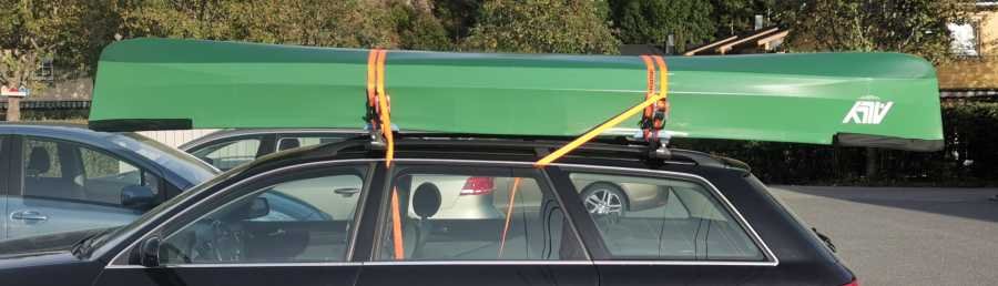 Jeg har aldri opplevd noe problem med å kjøre med en oppslått 16,5' Ally på taket. Jeg fester den da med to kraftige lastestropper med jekk. Stroppene går fram og tilbake over kanoen og strammes hardt til, så hardt at det er like før rørene begynner å bøye seg. Der kanoen ligger nedpå skistativet bruker jeg noe som beskytter og samtidig gir god friksjon både mot kano og mot skistativ. Bildet her er av en 13,7'-er, men jeg legger 16,5'-eren akkurat likt. Den er dog en del bredere. Man kan i tillegg ta en stropp og feste foran ned til støtfangeren, men jeg gjør ikke det og har vel aldri følt at dette har vært nødvendig. Det er kanskje ikke tidspunktet å drive rallykjøring i kraftig vind fra siden, men jeg pleier vanligvis å holde fartsgrensa med mindre jeg kjenner at det blåser så kraftig at det tar tak i kanoen. Kanoen sitter såpass høyt at du kjenner vind bedre enn når du ikke har kano på taket. Husk å feste seter ordentlig så de ikke ramler ut i ei dump, eller ta dem med inn i bilen. En 13,7' ved siden av oppslått er jeg usikker på hvordan går, men kanskje hvis 16,5'-eren legges ut mot siden og 13,7'-eren lener seg på skrå mot denne på andre siden. Hvor stabilt det er må du vurdere selv. Begge i pakket tilstand går fint. De tar ikke store plassen i et bagasjerom heller når alt er flatt. Det er jo tross alt stort sett bare luft i volumet av en kano. Duken er tynn og kan. Rørene kan spres utover og legges oppå eller under, eller stables mellom andre ting. Og hvis du har så kort bil at kanoen stikker utenfor fronten eller mer enn 1 meter bakenfor bilen, husk merking (Forskrift for bruk av kjøretøy)