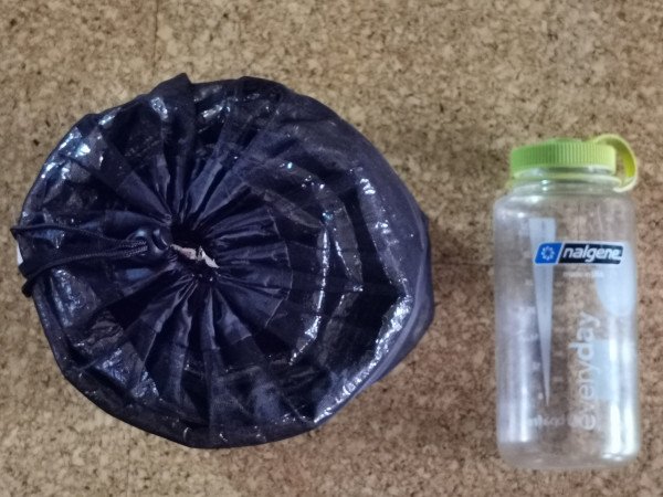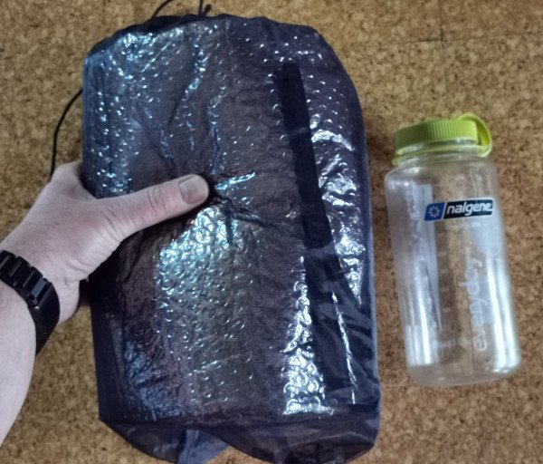 3. Jeg tok et par bilder så du får se hvor stort det er sammenrullet. Her ligger det i nett-posen som følger med (veier ingen ting). Det kan nok rulles enda litt hardere sammen. Flaska er ei 1 liter Nalgene.