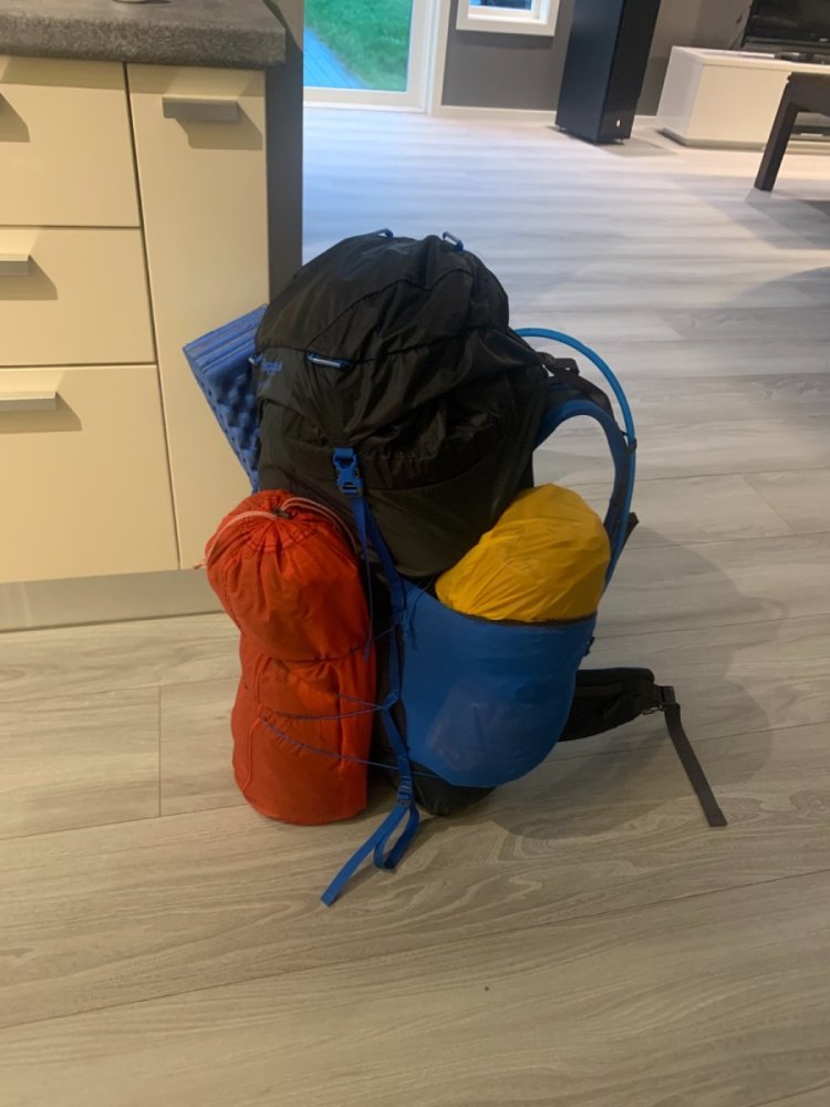 Jeg tenker å gå minst en topptur på ski med telt og sekk i år hvor alt må bære med, 1-2 overnattinger, og da dukket denne relevante tråden opp Det blir en serie med topper, en slags egen variant av «Høgruta». Turen gjennomføres når væremeldingen er grei, så jeg tar ikke med utstyr for polarstormen. En sånn type tur blir nemlig ikke gøy i dårlig vær, dårlig sikt og heller ikke med tung sekk. Pakkliste: - Sekk: Bergans Helium 55l. (1015 gram) - Camelback pose, 2 liter, med vinterslange. (Legges i soveposen om natten, for å ikke fryse) - Telt: Hilleberg Unna: (2005 gram, uten plugger, lette barduner). - Plugger: trenger ikke. Det holder med ski og staver til de 4 bardunene. Evt. pakkposer fyllt med snø hvis det skulle blåse opp veldig. Da kan stavene deles og brukes som plugger i hjørnene. Mulig jeg tar med 2 snøanker til langsidene, kanskje 🤔 - Liggeunderlag: Exped Synmat 7 3D MW pakket i en UL Schnozzle bag M (960 gram), og ett halvt thermarest z-lite (150 gram) - Soverpose: Cumulus Alaska 1200. (1795 gram med pakkpose.) - Varmejakke/pausejakke: Arcteryx Atom AR (450 gram) - Mellomlag: nordheim fleece (200 gram) - Campklær/nattøy: Boxer, sokker, ulltrøye, stilongs (600 gram). - «Teltsko»: tjukke stikkeluffer (190 gram) - Spade + skredsøker (pieps micro). - Sportsbriller med 2 linser, skibriller. - Hjelm, Grivel Duetto 220g. - GPS, kart og kompass - Hodelykt, petzl Nao. (Skal det kjøres i mørke brukes en Magicshine monteer 5500). - nødpeilesender (116g) - Powerbank, smarttelefon, - Repkit førstehjelp (350g) , nattflaske (85g, sammenleggbar), toalettsaker - MSR XGKII, 6 dl bensin, fyrtøy, MSR trillium base. - 1.8 liter kaffekjele til snøsmelting - En stor og liten brettekopp til kaffe, havregrøt og real. En skje. - Skallvotter - Evt: Er det veldig kaldt blir dunjakken og annabusken med. Ca 1-1,5 kilo ekstra, og da må trolig Den større sekken med. Skarejern/stegjern om terrenget og forholdene krever det. - Snøbørste (en halv oppvaskbørste med borret hull), kjøkkenhåndkle til å tørke kondens. Totalvekt: ca 12 kilo + mat ca 2 kilo for en helg. + drikke under marsj 2 kilo Totalt på ryggen under marsj ca 16 kilo. Sekken er som dere ser på bildet litt stappet, men det går, og hjelmen kommer i tillegg. Skal jeg oppgradere til Lowe Alpine Expedition sekken min kommer jeg opp i 1,5 kilo mer og havner på 17,5 kilo. God sekk det også, da haver alt inni og god plass. Det blir jo allikevel noen kilo til syvende og sist, noen som ser noen åpenbare punkter jeg kan kutte vekt? Det er muligens dette som må til. Skarejern og stegjern kommer utenom, det det trengs. I fjor var en sånn sesong. Jeg kan spare 300 gram på å ta med sommerunderlaget mitt, synmat 7 UL MW. Men litt redd for at det er litt kaldt om vinteren, selv med ett z-lite under overkroppen, kanskje noen har erfaringer der på snøen? 🤔 Skiturstyret er lett, og veldig godt å gå med: Hagan Ultra 77 164cm, ATK SLR release binding, Fischer Traverse Carbon, Hagan Mohair race feller: 2,4 kilo per fot med fellene på. Snøbørsten -