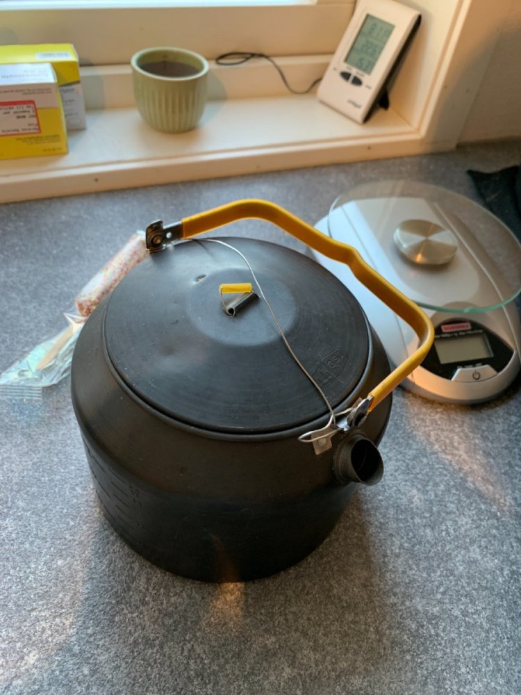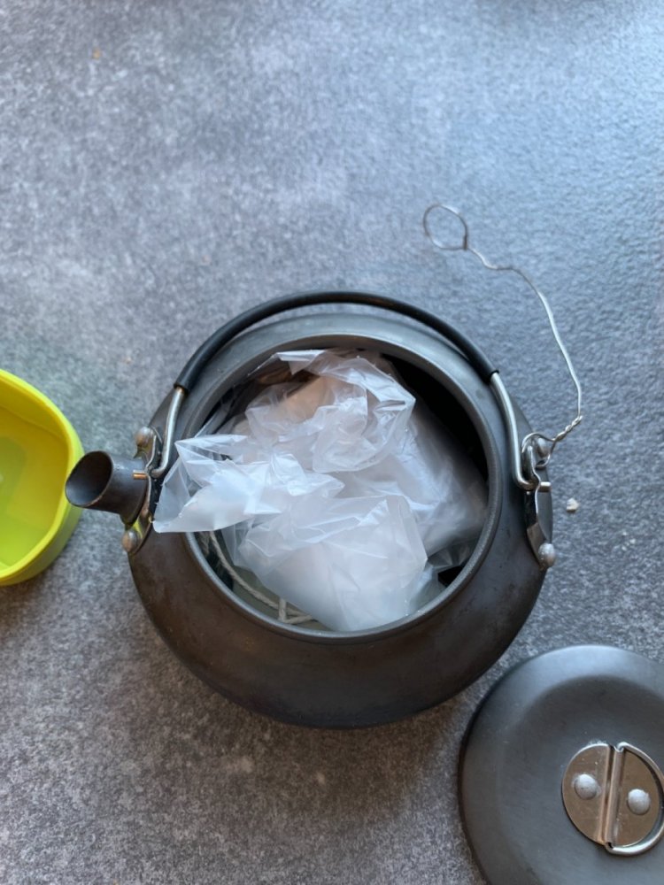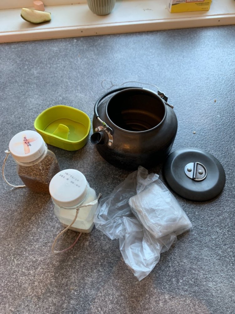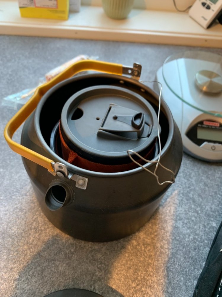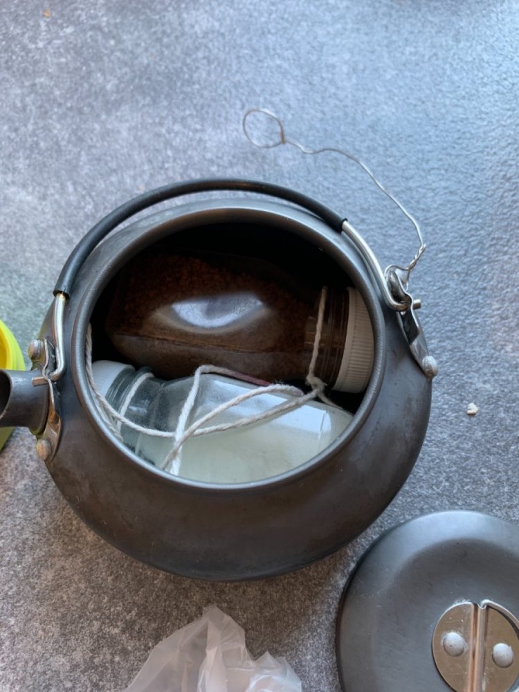 Takk, greit å få det avklart. Toaks sine 86 gram er kun kjelen uten lokk og håndtak ser jeg, så det blir ingen veltbesparelse hvis man ikke bruker kjelen som kopp. Ser argumentet med å ha det kompakt, det er nettopp derfor jeg vurderer å kjøpe en. Men siden jeg bruker Simmerlite som sommerbrenner, så blir det heller lite volumbesparelse. Med gassbrenner passer det nok bedre. Sånn pakker jeg kjelen min for tiden: Kaffepulver, melkepulver, en pose med te og sukketter, en brettekopp og en sammenleggbar skje som ikke er med på bildet. Ståltråden er for å holde lokket på plass i sekken. Ser ut som ingen bruker titankoppen til å drikke fra, men har med separat kaffekopp?