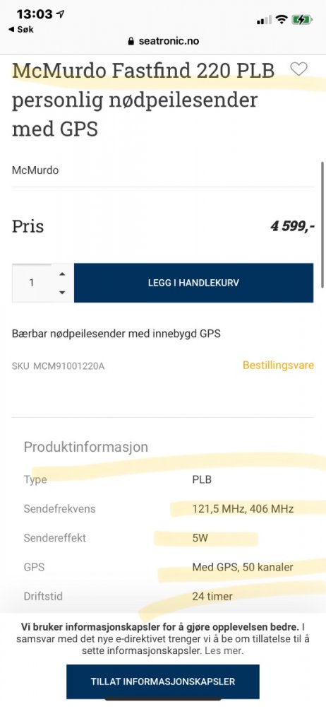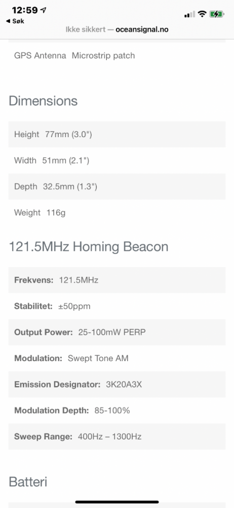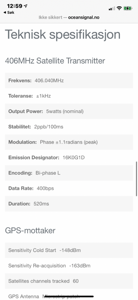 Redningsaksjon på Hardangervidda 10.3.2021Marius Engelsen svarte på Marius Engelsen sitt emne i Samfunnsdebatt Stemmer nok ikke det som står på wikipedia. Den jeg har sender posisjon til satelitter, og i minimum 24 timer med «homing beacon» på 121,5 mhz. http://www.oceansignal.no/index.php/produkter/rescueme/nodpeiler-plb1 Det gjør at letemannskapet kan peile deg nøyaktig inn selv om du har flyttet deg når de nærmer seg posisjonen du har sendt ut via satelitt. Det samme gjelder for Fast find 220: Det du bruker på jobb er sannsynligvis en «vanlig» maritim nødpeilesender, ikke en Personlig Nødpeilesender (PLB).? PLB registreres på person, har ikke AIS, og kan brukes overalt. En maritim nødpeilesender trenger ikke registreres på person, og kan ha AIS, men kan kun brukes på sjøen.