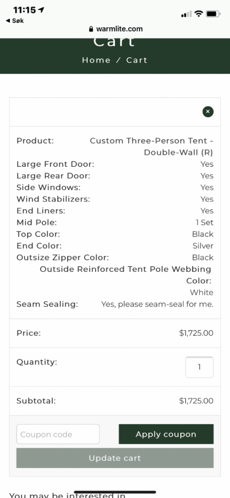 17. Ser ut som warmlite teltene har stive stenger? Dvs. Alustenger som er helt forbøyde, og settes ofte sammen bit for bit etterhvert som man trer de inn? Såvidt jeg har forstått vil dette gi stenger som er mange ganger sterkere enn vanlige teltstenger som står i spenn. Litt mindre praktisk med bøyde stangsegment i sekken. Kan i så fall forklare noe av påstandene om hvor mye vind teltene tåler, siden stengene ikke flekser som på vanlige telt. Da er behovet for barduner redusert også. Custom 3 person har stort sett samme høyde som vanlige tunelltelt, og har inngang i hver ende samt siden: https://www.warmlite.com/product/ultra-light-three-person-tent-4-season/ Med vindstabilisatorer, barduner, midtstang (?), og sidedør ble det ikke en fin pris. 1901 dollar med frakt. (1725 uten frakt). 20768kr pluss tollgebyr. 21.000 for ett telt er mye, men hvis man er 100% sikker på at dette er det eneste teltet man vil ha, så er der kanskje verdt det for den enkelte.