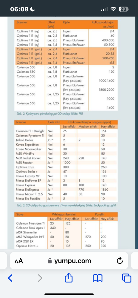 I sånne tråder pleier det alltid å komme inn en eller annen 111-gubbe å ødelegge tråden. Det har ikke skjedd enda, så nå griper jeg muligheten. 111T (altså kassebrenner med stillebrenner), går min MSR XGKII en høy gang på vinterturer, av en hel haug med grunner. Virkelig. Jeg elsker både lett sekk og lett pulk, men i pulken er den klart verdt vekten. Den brenner nydelig også på svørt lav effekt på bade parafin og bensin, så på lengre turer kan man fyre for kos og tørk lenge uten at man bruker mye drivstoff. Som teltovn synes jeg det er viktig at brenneren er stille, og at den kan med fin flamme på lav effekt slik at drivstoffet varer. Den fungerer, men den er ikke den beste teltovnen. Samtidig er vel XGK en av de brennerne med høyest CO produksjon når den går uten kjele, sammenlignet med andre brennere uten kjele over flammen.