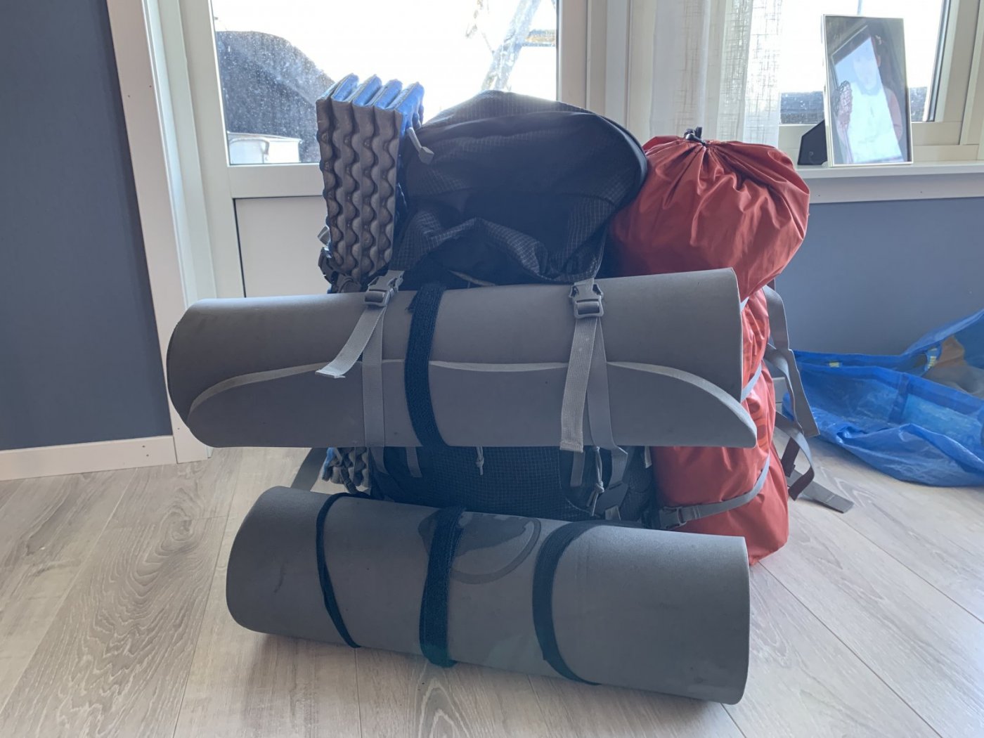 13. Til helgens overnattingstur for meg og De to ungene ser det slik ut: eller slik ut: ett bamse til hvert barn, oppblåsbart til meg i sekken, ett lite underlag til bruk ute og i fortelt, og ett Marmot Vapor 4p telt på siden. jeg er usikker på om en 130 liters sekk hadde vert noe bedre. De store kolliene er ganske volumiøse, men veier ikke så mye. Ville kanskje fått teltet nedi, men ikke det andre. I øs pøs regn, ville jeg nok tatt en søppelsekk på liggeunderlagene.
