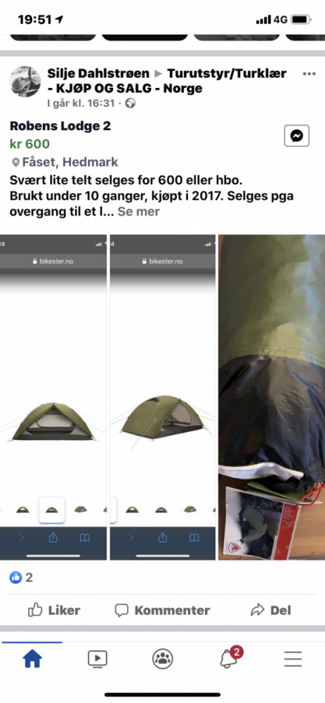 Føler meg plutselig veldig «ren» etter å ha lest tråden her! Har 3 telt: - Solotelt: Hilleberg Unna (12 år gammelt, nylig kjøpt på finn.no) - Vintertelt og «all round» telt: Fjellreven Abisko Endurance 3 (kjøpt pent brukt på finn.no). - Familietelt og luksustelt: Marmot Vapor 4P (kjøpt på tilbud på magasinet). Har 1 tarp: - Bergans Medium tarp (kjøpt for 200kr på finn.no for mange år siden. SOLID produkt!) Føler jeg er godt dekket med disse teltene og tarpen til bruk hele året i de aller fleste situasjoner og forhold. Mulig jeg skulle hatt ett mesh innertelt til Unna til Sommerbruk, men det er alt jeg kanskje kommer til å savne.