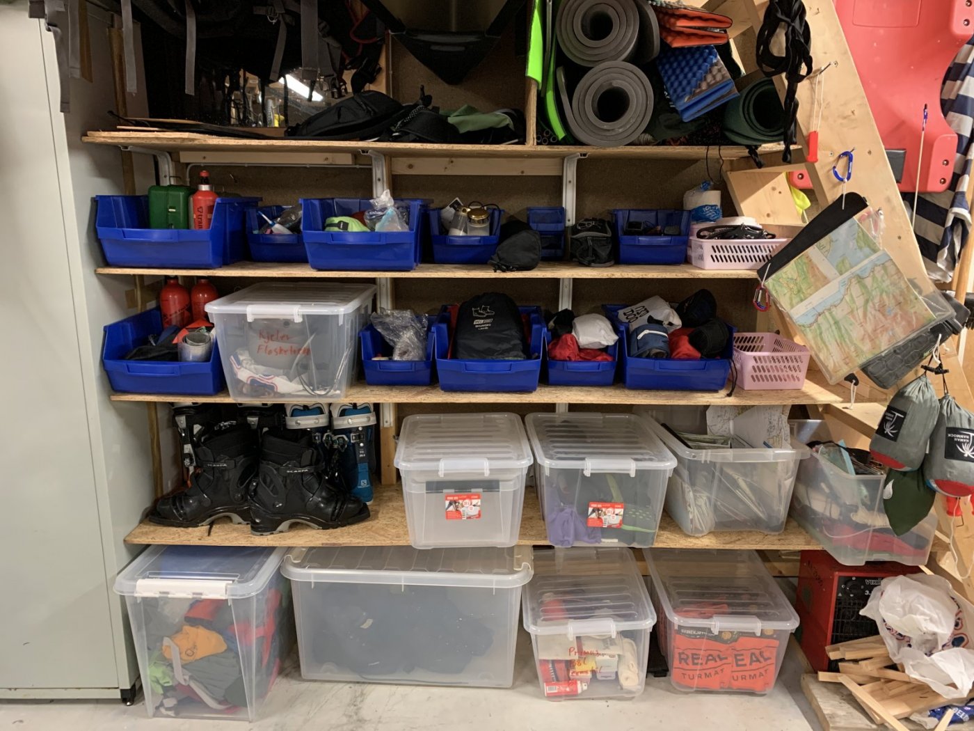 Det er jo det jeg sier. Jeg har byttet ut en del av de gjennomsiktige store kassene med lokk, fordi det gir bedre oversikt når ting ligger i åpne modultrau. Og så slipper man å trekke ut hver kasse for å ta ut de større tingene, man bare plukker tingene. Dette er i en garasje, så det utgår med sånn type PAX løsning. Man må nesten bare prøve selv, jeg synes det er mye bedre enn å lete gjennom plastkasser. Jeg bruker nå begge deler. Akkurat nå har jeg kommet så langt: ryggsekkkene henger i taket, ski og staver henger på loftet. exped underlag ligger halvveis oppblåst på loftet, det samme med teltene og syntetsoveposer (ligger i store hotellpute-poser med en pose silicagel). Dunposene ligger i oppbevaringsposene i huset. Nå skal jeg lage nye merkelapper. Brennertilbehør, vintertelting, skismørning, feller, hodelykt, msr, 111, skibriller, kniv/øks, etc. vet ikke hvor viktig merkelappene er, det er jo bare jeg som går der, men det føles godt i magen å ha lapper på 👍 Fikk kastet og solgt/gitt bort en del gammelt i samme slengen- 24 svar