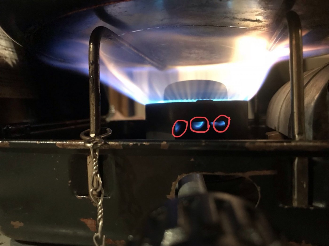 Har hatt min Optimus 111C i 19 år, og den er i flittig bruk. Ikke lenge siden den har fått en god rengjøring, jeg kan en del om disse brennerene, men tydeligvis ikke alt. Kokte suppe i dag, det blåste litt, jeg så det kom flammer under brennerhodet når den gikk på fullt, jeg måtte skru ned for å unngå dette. Hjemme på kjøkkenbenken får jeg den til å brenne fint på fullt, av og til en liten blå flamme under. Men etter å ha blåst litt på den kan det komme små blå flammer under brennerhodet. Jeg klarer av og til å blåse de ut. Det er ikke lekkasje fra pakkboksen eller dysen. Dysen er rengjort og ser tilsynelatende fin ut. Brennerskallene er rengjort, og det er lite sot på brenneren. Jeg forvarmer med bioetanol, det gir null sot. Flammene oppstår ikke av gass som ikke har kommet ut via ytre brennerskall. De kommer av gass som blir presset ned gjennom disse hullene: Det ser slik ut. Ute i vinden var det nok litt mer: Jeg har ikke lagt merke til dette før, kanskje det alltid har vert der? Kan noen med en 111C dobbeltsjekke med parafin og M dyse. 1: Er dette underburn? 2: Er dette normalt? 3: Om det er unormalt, hva kan årsaken være? 4: Er det noe å bry seg med? Takker for hjelpen