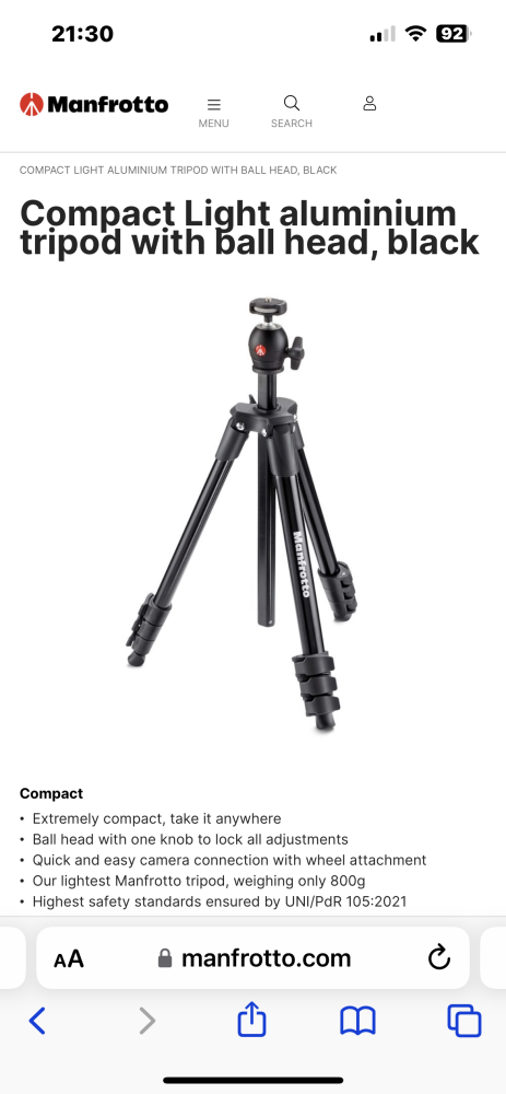 Jeg hadde tidligere Manfrotto Compact Light. Det var jeg alvorlig bra fornøyd med. MYE mer stabilt enn andre stativ 400-600 grams klassen. Helt «stumt og dødt» når jeg brukte det, mens andre i samme klasse var en eller annen form for bevegelse i eller trengte lang tid for å roe seg. Også enkelt å sette opp, og justere, det oser av kvalitet. https://www.manfrotto.com/global/compact-light-aluminium-tripod-with-ball-head-black-mkcompactlt-bk/