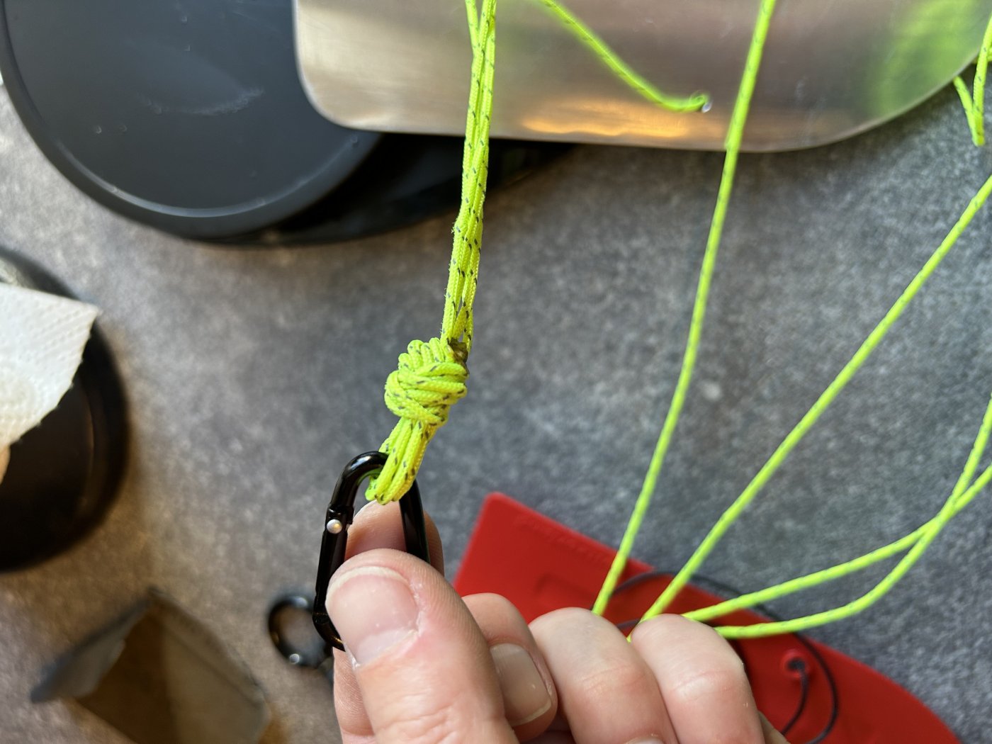 Det brukes to liner på disse. Man kapper de i helt lik lengde. Ene enden av linene tres gjennom det øverste hullet i midten, fra baksiden av ankeret, slik at man får to liner gjennom det hullet. Andre enden av linene tres gjennom hvert sitt hull på siden av ankeret, så da får man en line gjennom hvert av disse hullene. De 4 endene man nå har på ankerets forside (mot teltet), lager man en overhåndsknute på, og trer i en liten karabinkrok eller solid plastkrok etter eget ønske. Jeg foretrekker små e-bay karabinkroker. —————— Når man setter ankerne graver man ett tak med spaden, eller bare trakker de rett ned i snøen, på skrått mot teltet. Så drar man tauet slik at det skjærer seg ned i snøen i retning bardunen/teltet, og ved behov graver man snø over og trakker kompakt. Karabinkroken er da nesten alltid over snøen enda, med mindre der er veldig dyp og løs pudder man må grave ned i. (Men det pudderet får ligge i fred, er det oftest ikke mye vind å tenke på). Med karabinkrok, framfor ringer som man trer bardunee gjennom, blir prosessen med å grave de ut fra snøen dagen derpå mye lettere- 9 svar