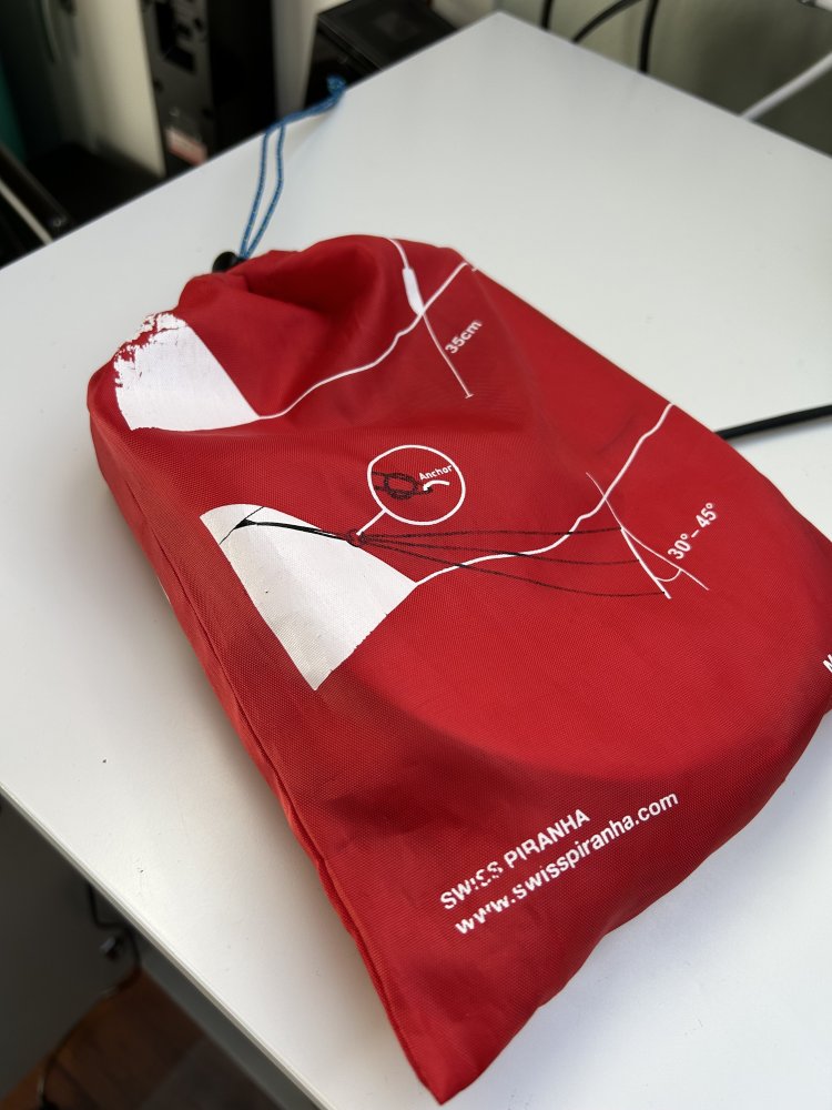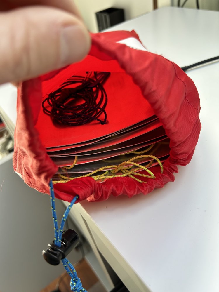 Jeg hadde tenkt å bruke 4mm maljer i hullene, men de var tom for maljetang på biltema, så da ble det uten. Jeg har dratt slipepapir gjennom hullene i stedet, for å unngå skarpe grader. Jeg har prøvd å gnage av snoren i hullene, men jeg har ikke fått det til, selv med denne tynne snoren. Når disse er plassert i snøen blir det heller ikke bevegelse på snoren imot hullkantene, så det er kun når du tar de opp, eller setter de ned, det blir bevegelse der. Så gnag er nok ett ikkjeeksiterande problem Skulle det allikevel skje på tur, eks. om man kutter de med spaden eller noe, virker de enda om en snor ryker, men litt redusert hold. Og det er svært enkelt å reparere: bare dra snoren gjennom på baksiden og knyt sammen. Man får også tykkere bardunsnorer som er svært motstansdyktig mot spadeblad og slikt. Men disse tynne som originalt er på snøankrene, og de jeg har brukt, er myke og lette, og pakker fint sammen i posen -